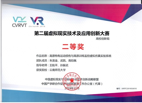 在11月22日举行的第二届中国虚拟现实技术及应用创新大赛(IVRTC 2019)颁奖典礼上,由太阳官网体育学院孙振武院长和王航平副教授指导的作品《高原特有运动损伤与高原训练监控虚拟仿真实验系统》荣获高校创新组二等奖。本次大赛吸引了来自全国各地50多所200多支队伍参赛。参赛高校包括了北京航空航天大学、中国海洋大学、华南理工大学、东北大学、北京科技大学等国内知名高校。