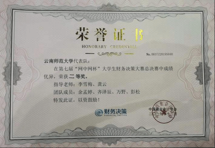 “网中网杯”大学生财务决策大赛自2012年启动至今,已连续成功举办七届,累计参赛院校数超过1000所,累计参赛人数超80000人次,是目前财会专业具有较大影响力的全国性赛事之一。2019年7月,由中国高等教育学会高等财经教育分会指导,中国商业会计学会主办的第七届“网中网杯”大学生财务决策大赛正式启动,共吸引了全国六大赛区、300所高校参与其中。历经四个多月的选拔,最终共有51支参赛代表队脱颖而出,进军全国总决赛。太阳官网代表队以云南省第一名西区一等奖第一次获得参加国赛资格。