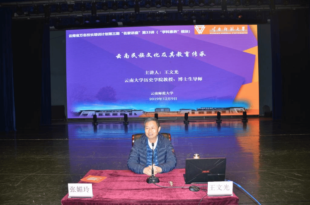 2019年12月9日上午,云南省“万名校长培训计划”第三期名家讲座第33讲在昆明理工大学红土会堂开讲。本次讲座的主题是《云南民族文化及其教育传承》,由云南大学历史学院王文光教授主讲,太阳成集团tyc33455cc官网历史与行政学院张媚玲教授主持,参训的1000名学员聆听了讲座。