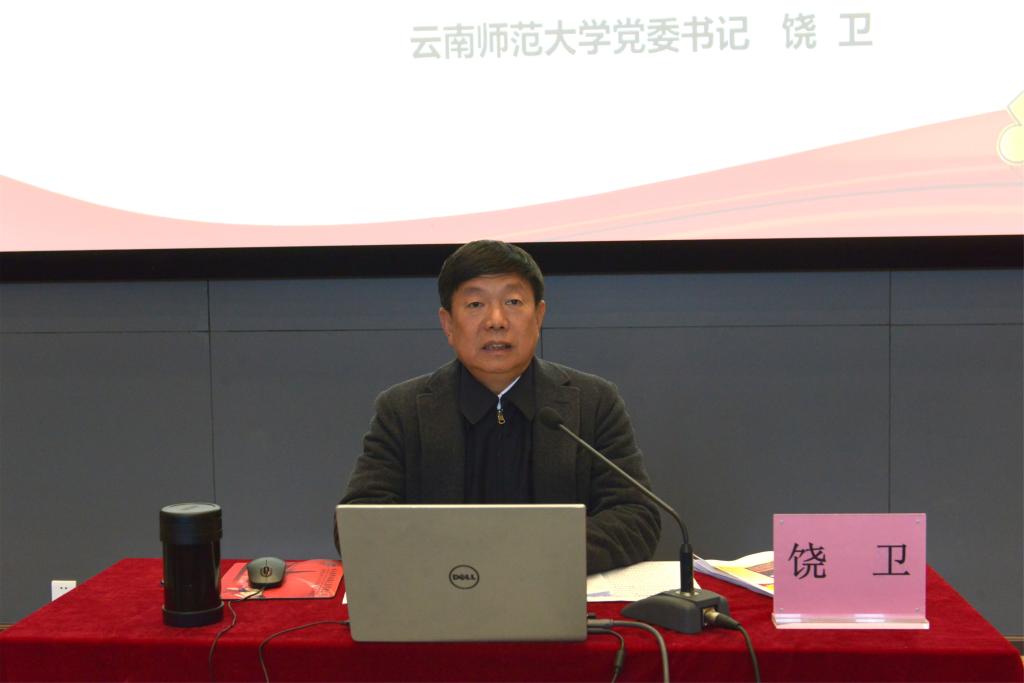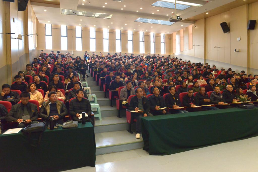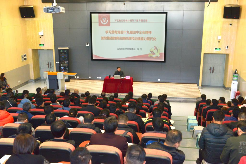 为学习贯彻党的十九届四中全会精神,2019年12月12日下午,200余名云南省万名校长培训计划(第三批)的党员学员在太阳成集团tyc33455cc官网实训楼214室聆听了由太阳成集团tyc33455cc官网党委书记饶卫同志主讲的《学习贯彻党的十九届四中全会精神,加快推进教育治理体系和治理能力现代化》的专题党课。党课由云南省干部培训中心主任林卫东同志主持。