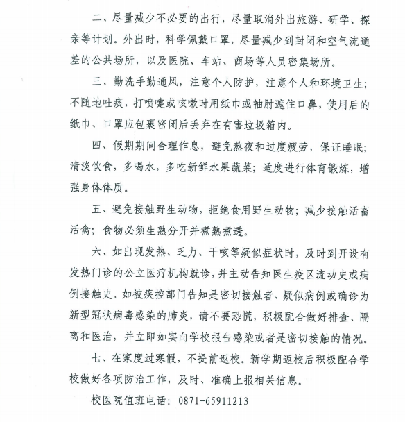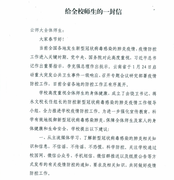 上一条:校党委书记饶卫一行检查指导疫情防控工作 下一条:云南省2020年春季学期新冠肺炎疫情防控开学第一课专家授课视频