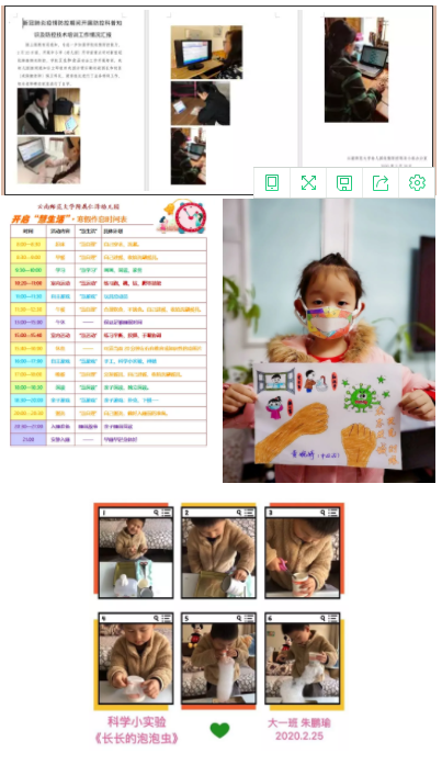2020年的寒假和春节因为有了这个叫“新冠状病毒”的“小怪兽”而变得既特殊又不平凡,为此幼儿园使用了延期开学、自觉隔离的办法防御病毒攻击。幼儿园发动教师,发挥智慧,让幼儿“宅”在家中,更有意义地度过这个史上最长且不便出门的假期。其中包括师大幼儿园、附属呈贡幼儿园、附属仁泽幼儿园、附属盘龙幼儿园、附属七彩云南幼儿园、附属官渡幼儿园、附属俊发城幼儿园在内的附属幼儿园积极响应学校的疫情防控指示,扎实做好幼儿园的防疫工作:一是迅速展开联防联控工作;二是团结一心,精准施策;三是制定疫情防控工作方案、预案;四是全园动员齐战“疫”,携手筑牢防护线;五是提前筹划 做实做全;六是开展线上管理与教学。疫情是本“教科书”,对于孩子们来说,眼前正在发生的一切,就是一本生动而深刻的教科书。幼儿园正在通过这本鲜活的“教科书”,让孩子们学会观察,学会思考,学会应对从而使幼儿笃定信心,见证胜利,并树立起与这场“战役”相关的各种正确观念,为幼儿扣好人生的第一粒纽扣。