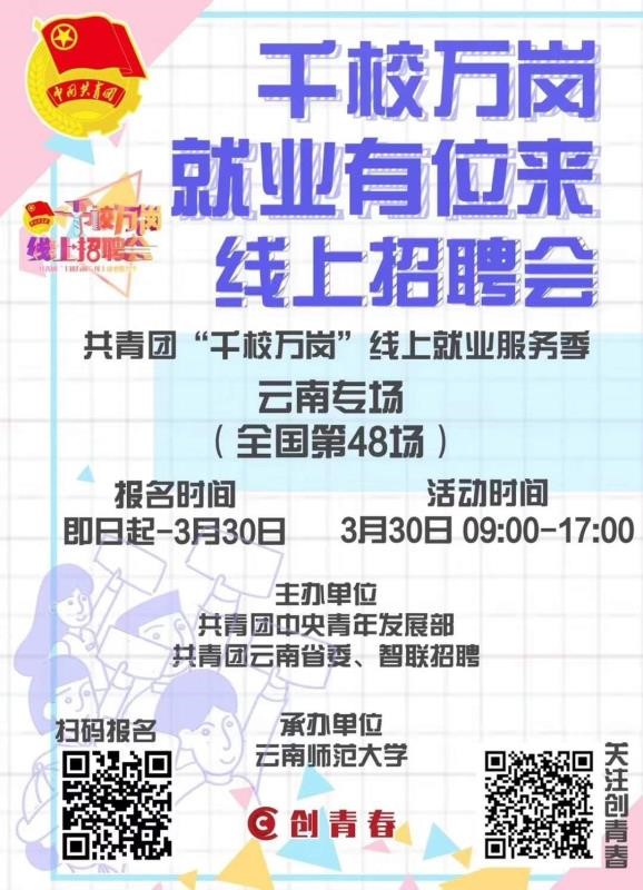 为贯彻习近平总书记关于统筹推进新冠肺炎疫情防控和经济社会发展工作的重要指示精神,落实团中央《共青团“千校万岗”线上就业服务季工作方案》的相关要求,做到“就业服务不打烊,网上招聘不停歇”,减少疫情对毕业生就业工作的影响,促进太阳官网毕业生更充分和更高质量就业。3月30日,由共青团中央青年发展部、共青团云南省委主办,太阳官网和智联招聘承办的2020届毕业生空中双选会成功举行。
