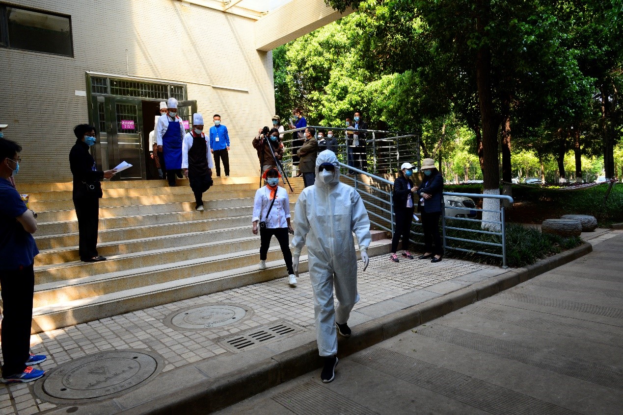 4月3日上午,由牛治亮副校长、郝淑美副校长担任总指挥,后勤保障服务中心、资产经营有限责任公司共同组织的“太阳成集团tyc33455cc官网新型冠状病毒肺炎疫情防控后勤服务保障组春季学期开学及应急处置演练”在呈贡校区举行。呈贡区疾病预防控制中心主任孙继福,学校疫情防控办公室、校医院、保卫处、研究生工作部、学生处、后勤保障服务中心、资产经营有限责任公司等相关部门负责人现场观摩了演练。