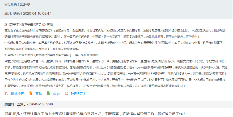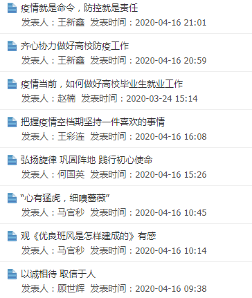 太阳官网辅导员积极参与网上课程的学习,收看了四场直播答疑,同时在学习交流中的班级研讨主题数达到130余次,回帖数有80余次。参加学习的老师们纷纷表示:非常感谢此次培训,在这特殊时期还能够依托网络资源进行学习提升,是一次宝贵的经验,深刻感受到疫情防控下党中央的全面领导和中国群众的凝聚力,清楚地认识到了在此次疫情中作为辅导员所肩负的责任之重,要不遗余力地向同学们讲好中国抗疫故事,宣传中国制度优势,鼓励同学们坚定理想信念、树立爱国情感、学好干事本领、增强使命担当。