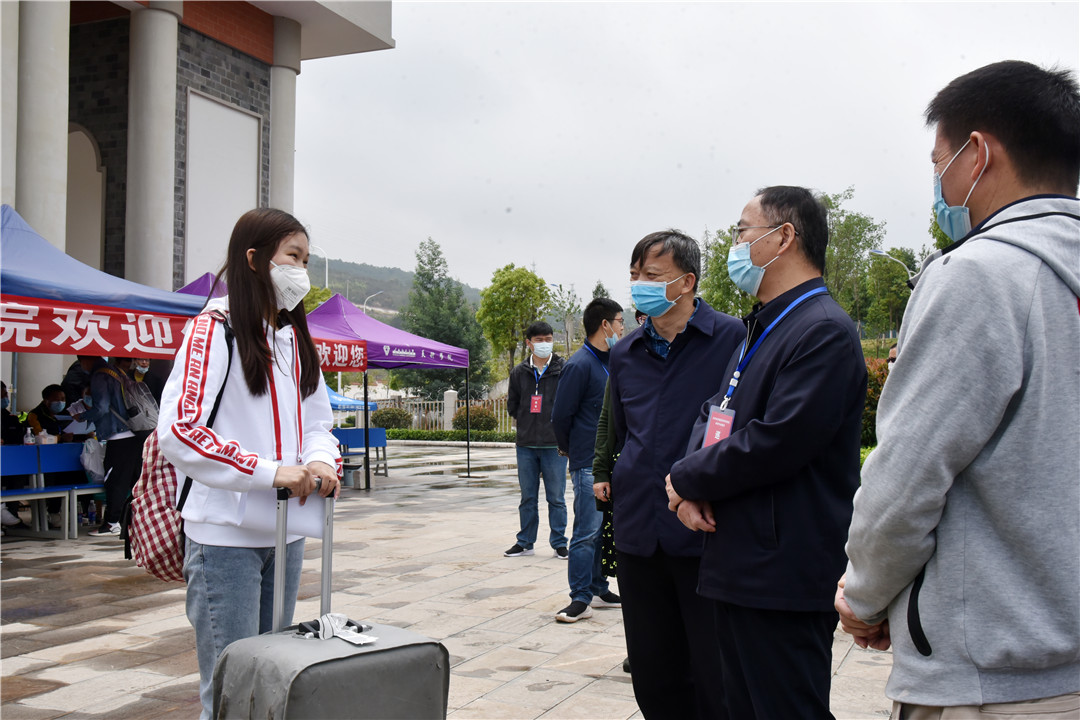 饶卫书记、蒋永文校长一行分别检查了学校呈贡校区学生返校迎接点情况,听取有关部门负责人关于疫情防控和返校复学工作开展情况汇报,详细了解返校学生人数和学生防疫物资、应急情况处置等准备情况。