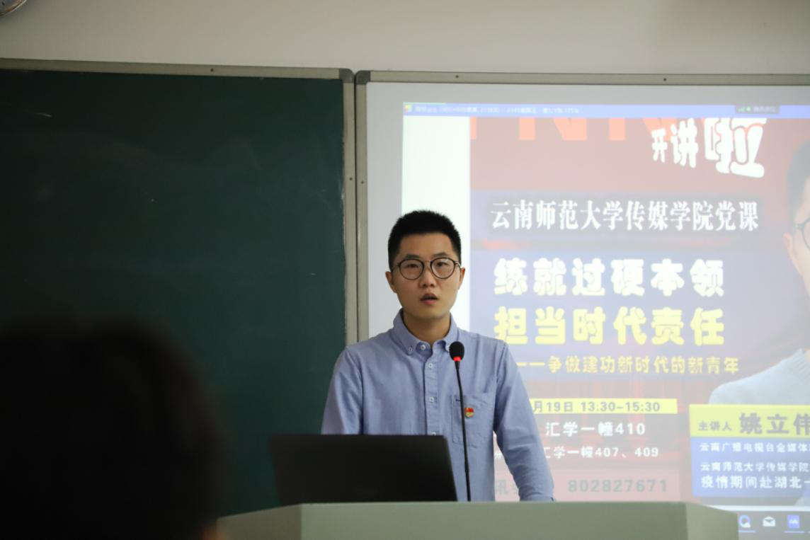 “把疫情一线的温暖和正能量、把那些鼓舞人心的事迹好好报道出来,这是我作为一名记者最大的想法,更是我作为党员的初衷。”6月18日上午,传媒学院在呈贡主校区汇学一栋410教室举行“党课开讲啦”——学习身边的榜样专题党课,邀请传媒学院2019级非全日制研究生、云南广播电视台全媒体新闻中心记者姚立伟同志担任党课主讲人,以《练就过硬本领,担当时代责任》为主题讲述了疫情期间随云南省援助湖北咸宁医疗队奔赴当地采访的经历与感悟。校党委副书记李宏,传媒学院党委书记魏红、副书记马春雨,以及传媒学院200余名党员、积极分子一起参加了党课,党课由传媒学院新闻系教师党员柳盈莹主持。为了严格执行疫情防控要求,本次党课除了主会场410教室外,还设置了三间教室作为分会场,观看线上直播。