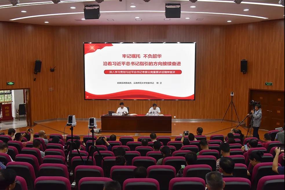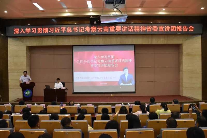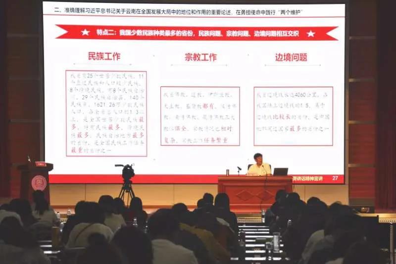 饶卫书记以《牢记嘱托 不负韶华 沿着习近平总书记指引的方向接续奋进》为题,围绕以下五个方面进行宣讲:一是准确把握习近平总书记考察云南重要讲话精神的重大理论意义和现实意义,坚定不移沿着总书记指引的方向奋勇前进。二是准确理解习近平总书记关于云南在全国发展大局中的“四个特点”的重要论述,在勇担使命中践行“两个维护”。三是准确把握习近平总书记对云南作出的“四个方面重要指示”的深刻内涵,把总书记为云南谋划的宏伟蓝图变为美好现实。四是深刻领会习近平总书记考察西南联大旧址重要指示精神,大力培养有历史感、责任感、志存高远的时代新人。五是抢抓重大机遇,推动习近平总书记考察云南重要讲话精神在太阳成集团tyc33455cc官网落地生根、开花结果。饶卫书记的宣讲报告主题鲜明、逻辑严密,深入浅出接地气,系统阐释了习近平总书记考察云南重要讲话精神的重大意义和丰富内涵,为我们进一步全面理解习近平总书记考察云南重要讲话精神,深刻领会其中蕴含的世界观、价值观和认识论、方法论,准确把握云南各项事业在全国发展大局中的坐标方位、前进方向,确保各项事业始终沿着正确方向前进提供了思想支撑,也为我们进一步从中华民族伟大复兴的战略高度弘扬西南联大爱国精神,培养社会主义建设者和接班人提出了努力方向。