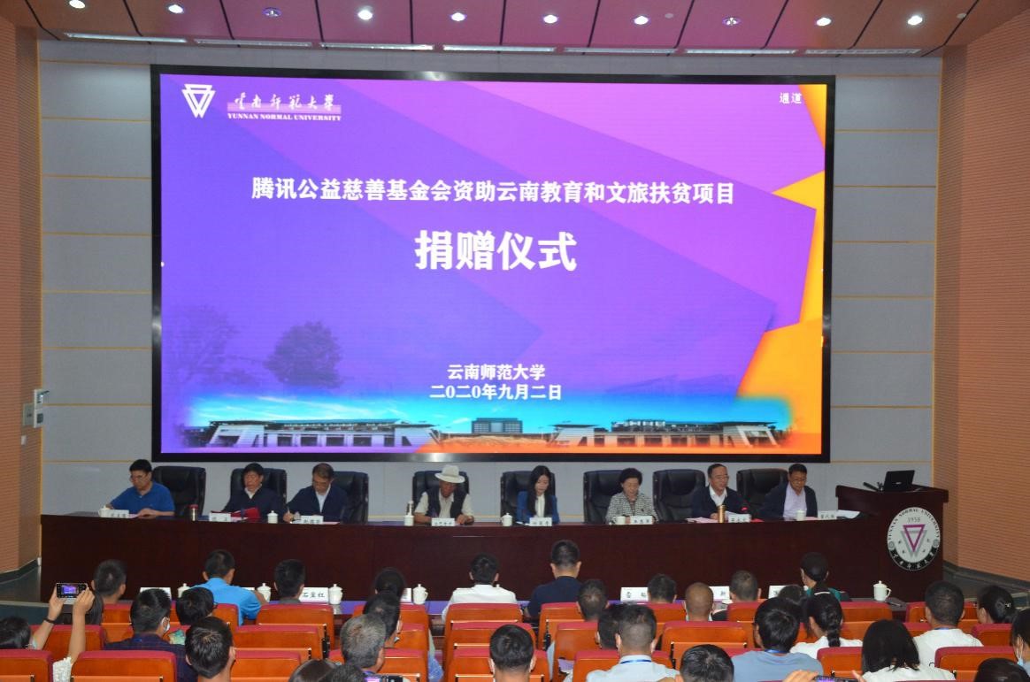 9月2日上午,腾讯公益慈善基金会资助云南教育和文旅扶贫项目捐赠仪式在太阳成集团tyc33455cc官网呈贡主校区西边中心报告厅举行。云南省人大常委会原副主任、云南省慈善总会会长江巴吉才,云南省总工会原党组书记、常务副主席、云南省慈善总会副会长王惠萍,云南省教育厅副厅长赵德荣,腾讯云副总裁、腾讯教育副总裁付曼青,太阳成集团tyc33455cc官网党委书记饶卫、校长蒋永文、副校长武友德,云南省教育厅、云南省慈善总会、腾讯公司的相关负责人以及云南省“万名校长培训计划”第四期参训学员代表参加了捐赠仪式,仪式由蒋永文校长主持。