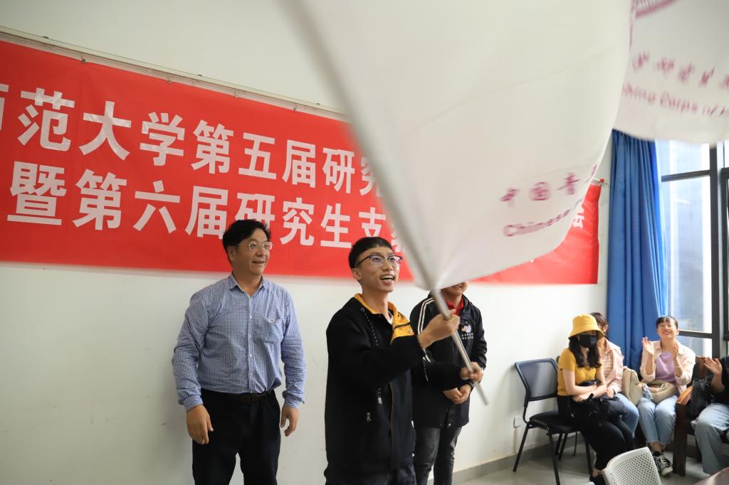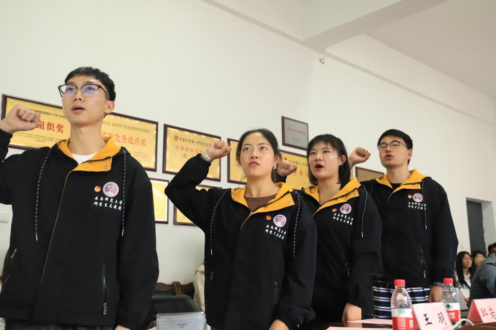 最后,刘副校长向第六届研究生支教团授旗,由队长韩涛接旗,并带领全体第六届研支团成员庄严宣誓。他们将用自己一年的青春热血,在龙泉中学开辟新的天地。