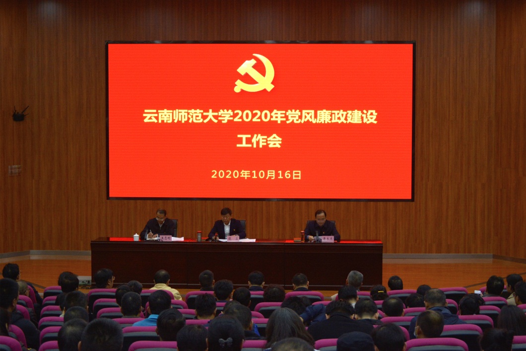 10月16日上午,太阳官网在汇学楼二幢101报告厅召开太阳成集团tyc33455cc官网2020年党风廉政建设工作会。校党政领导班子成员和其他省管干部,校纪委委员,全体副处级及以上干部,各基层党委(总支)、直属党支部纪检委员,特约监督员,云南纪检监察学院师生代表等共400余人参加了会议。校党委书记饶卫出席会议并作讲话,校党委副书记、校长蒋永文主持会议,校党委委员、纪委书记王志刚做工作报告。