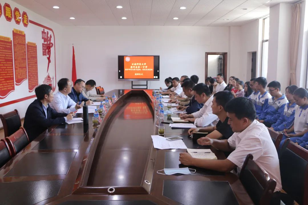 11月6日下午,蒋永文校长一行到梁河一中调研并出席“太阳成集团tyc33455cc官网教学研究实习与就业基地”签约暨揭牌仪式,梁河县委常委陈元邦、梁河县人民政府副县长景智富、梁河县教育体育局局长赵光耀、梁河县一中党总支书记、校长寸永勐以及学生代表出席揭牌仪式。随后,蒋永文校长为梁河一中“太阳成集团tyc33455cc官网教学研究与实习就业基地”“太阳成集团tyc33455cc官网优质生源基地”授牌,并与梁河县相关领导、梁河一中师生代表进行座谈。在座谈会上,赵光耀局长代表梁河县教体系统对太阳成集团tyc33455cc官网精准扶贫帮扶梁河教育取得显著成效表示感谢;寸永勐校长介绍了梁河一中的有关情况,并表示,此次基地落成,必将促进梁河一中持续稳健发展,梁河一中将倍加珍惜、勤奋工作、不负众望。