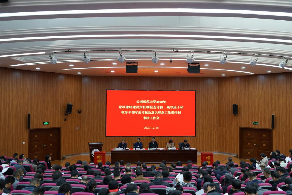 根据省纪委、省委组织部、省委宣传部的安排部署,12月15日,由省委教育工委副书记、省教育厅党组成员陈世波带队,云南中医药大学纪委书记李媛芬任党风廉政建设责任制检查考核组组长、云南民族大学党委副书记李光明任省管领导班子和领导干部年度考核组组长的省委教育工委第三检查考核组对太阳官网2020年党风廉政建设责任制、领导班子和领导干部年度工作及意识形态工作责任制落实情况进行考核。学校在呈贡主校区汇学楼报告厅召开2020年度工作考核会,校领导班子成员、其他省管干部、近三年退休校领导、处级实职干部,专家学者和教职工代表参加会议。会议由校党委副书记、校长蒋永文主持。
