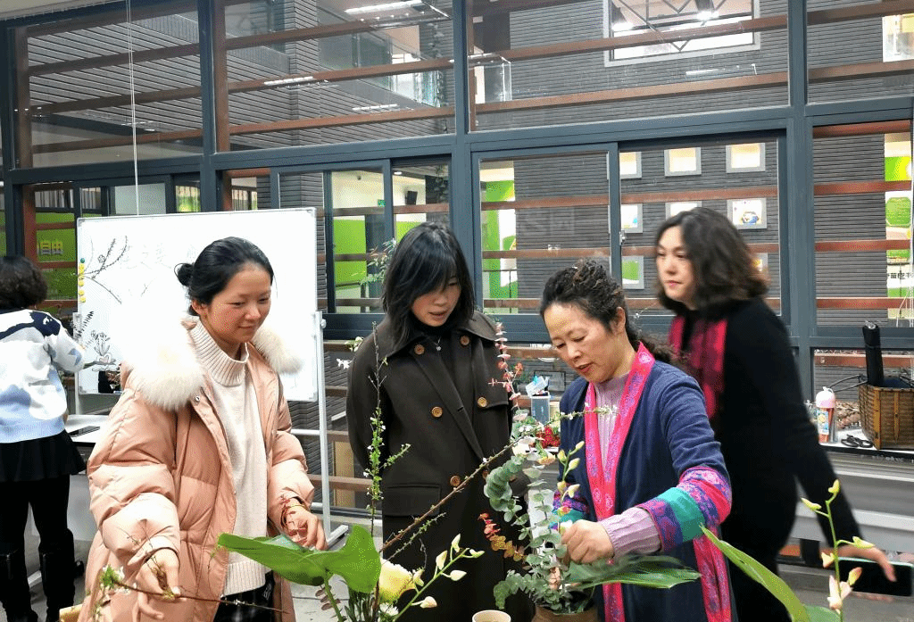本次活动特邀生命科学学院桑林副教授进行园艺插花指导,在活动中桑老师从插花艺术要领、东西方插花的特点与欣赏、东方传统插花艺术的风格等方面做了讲解,并现场进行插花演示。各位老师和同学在桑老师的指导下进行作品创作,体验插花活动的乐趣,整个体验活动在愉快欢乐的氛围中进行。