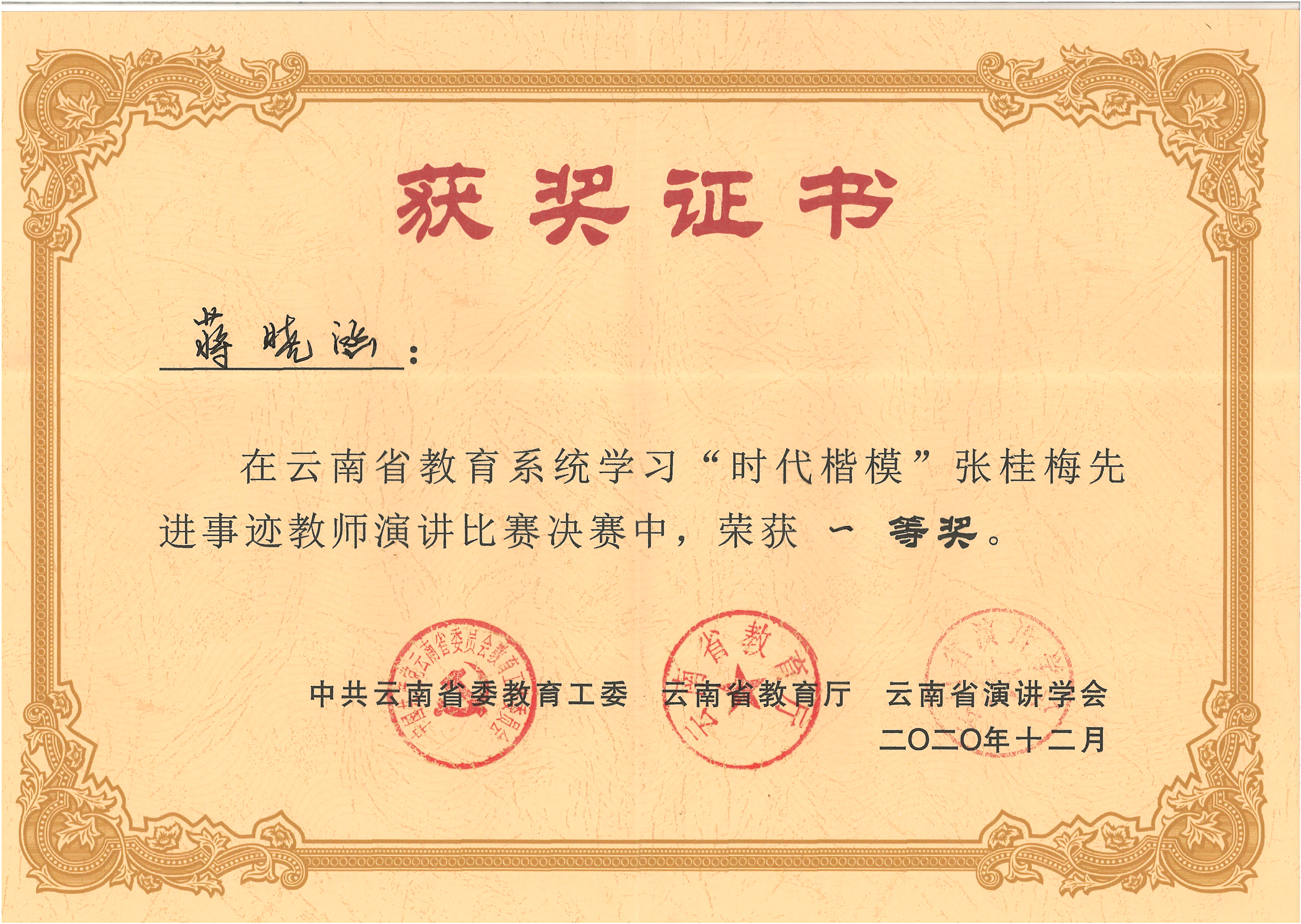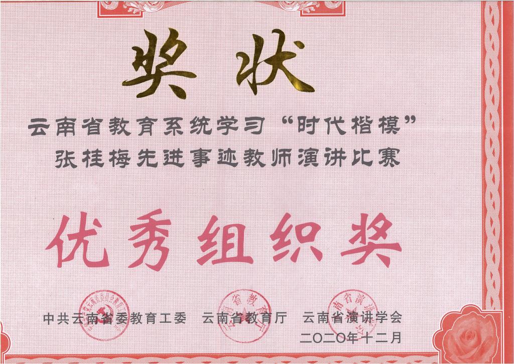 12月30日,由中共云南省委教育工委、云南省教育厅主办,云南省演讲学会、国家教育行政学院承办的学习“时代楷模”张桂梅先进事迹教师演讲比赛决赛在云南省教育厅大礼堂举行。太阳官网荣获优秀组织奖,教师代表蒋晓涵老师从众多选手中脱颖而出以高比分夺得高校组第一名折桂一等奖。