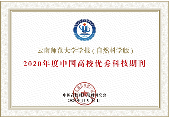 《太阳成集团tyc33455cc官网学报(自然科学版)》荣获中国高校科技期刊研究会颁发的“2020年度中国高校优秀科技期刊”。该项目遴选依据北大核心数据、CSCD数据、科技核心数据、知网学术评价数据、万方扩刊版数据、中信所精品科技期刊和百杰期刊及知网国际影响力数据等第三方客观数据,经过加权计算,从中国高校科技期刊研究会1000多家期刊中遴选产生。这是本刊继2016年和2018年荣获该奖项之后连续第三次获得该奖项。