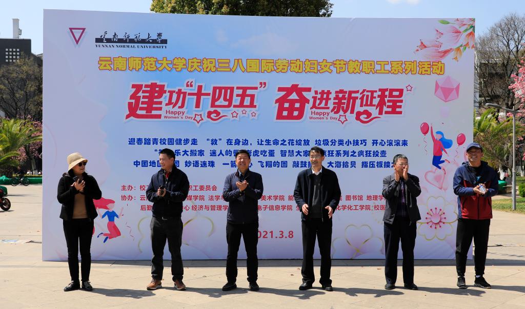 为庆祝“三八”国际妇女节、营造积极健康的校园文化生活,使女教职工们在轻松愉悦的氛围中度过一个快乐、有趣的节日,3月8日,由校工会和校工会女职工委员会主办、各二级部门工会协办的以“建功‘十四五’、奋进新征程”为主题的教职工活动在呈贡主校区红烛广场举行。校党委书记饶卫、校党委副书记张玮、副校长刘宗立、副校长蔡金红、副校长郝淑美以及全校女职工、部分男教职工代表1000余人参加了活动。