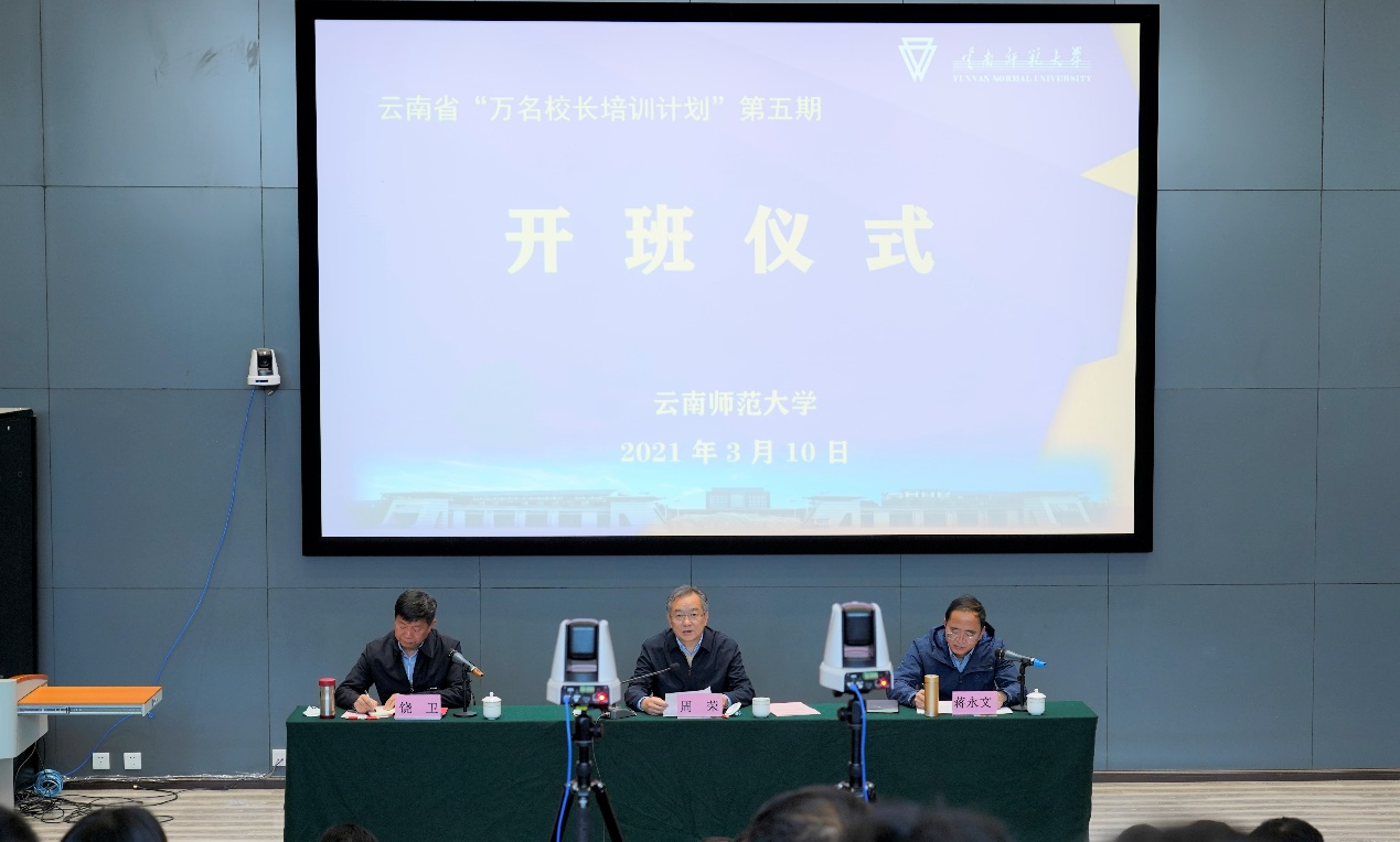 3月10日上午,太阳官网举行云南省“万名校长培训计划”第五期培训班开班仪式。为做好疫情常态化防控工作,开班仪式采取线上线下同步进行的方式,主会场设在呈贡主校区国家教师教育教学实验中心Ⅱ区报告厅,分会场设在国家教师教育教学实验中心20个培训班教室。云南省委教育工委书记、教育厅党组书记、厅长周荣,副厅长赵德荣,太阳成集团tyc33455cc官网党委书记饶卫,党委副书记、校长蒋永文,党委副书记张玮,副校长武友德,省教育厅教师工作处、万名校长培训计划项目办公室负责人,以及来自全省16个州(市)的“万名校长培训计划”第五期全体参训学员参加了开班仪式。开班仪式由蒋永文校长主持。