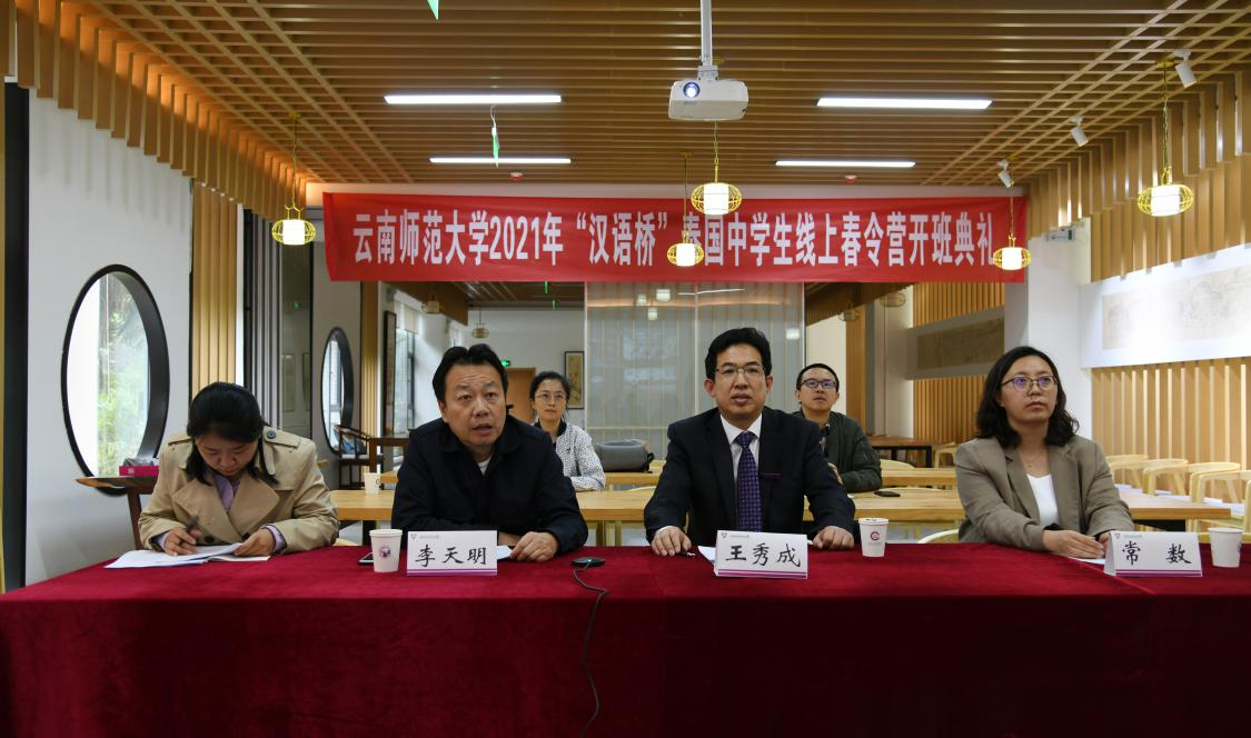 为进一步做好中文国际推广与中外人文交流工作,延续“汉语桥”项目热度,太阳官网国际汉语教育学院承办了国家中外语言交流合作中心2021“汉语桥”泰国中学生线上春令营项目。4月4日上午,春令营开班典礼以“云连线、云直播”的方式,在太阳官网呈贡主校区同析2号楼茶艺教室、泰国清迈地区拜县中学大礼堂和清迈大学孔子学院会议室三地同时举办。国际汉语教育学院院长王秀成、党委副书记常数、副院长李天明,泰国清迈地区拜县中学副校长金达女士,清迈大学孔子学院中方院长沈毅等领导出席,太阳成集团tyc33455cc官网汉语国际推广师资培训基地(昆明)全体工作人员、拜县中学教师代表以及122名春令营营员学生参加,开班典礼由李天明副院长主持。