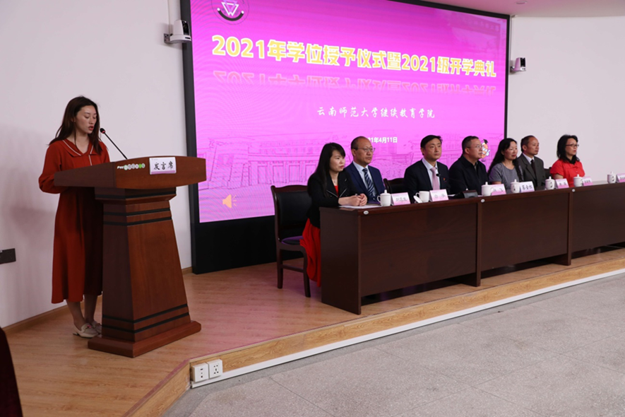 4月11日上午,继续教育学院在一二·一西南联大校区举行“2021年学位授予仪式”暨“2021级开学典礼”。校党委委员、副校长蔡金红,继续教育学院全体领导、学位委员会委员、教务科及招考科全体教师、毕业生代表和新生代表参加了此次活动。典礼由继续教育学院党委书记肖飞主持。