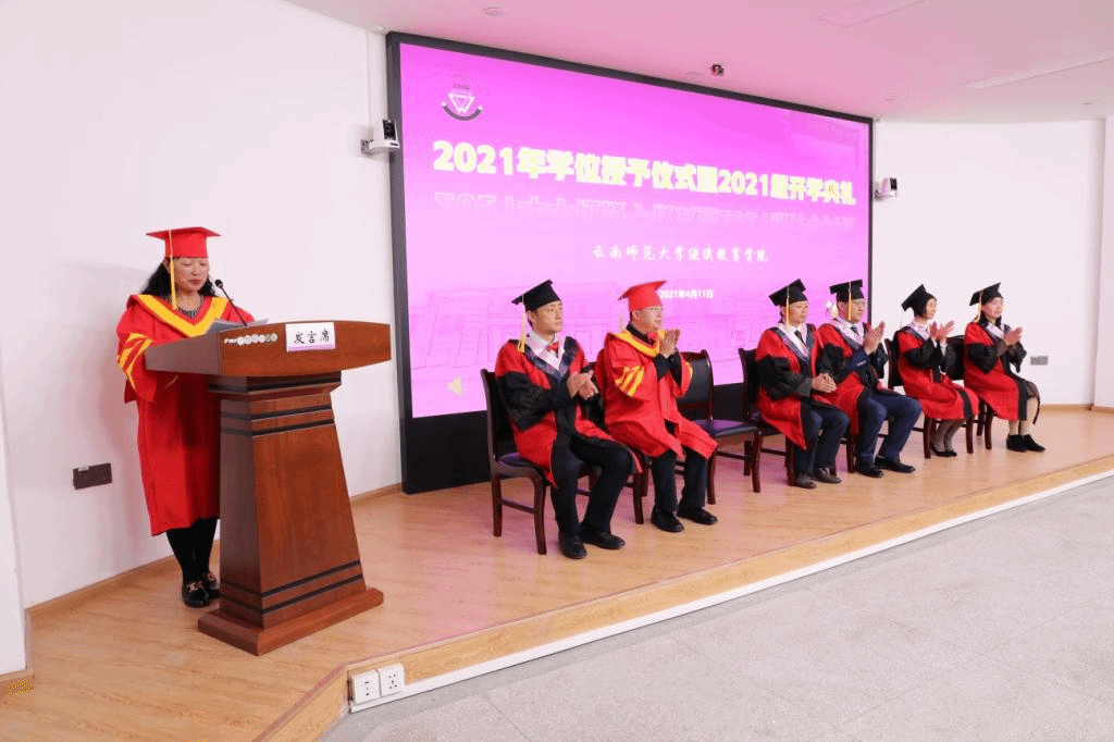 继续教育学院唐瑛院长向2020级获得学士学位的59名毕业生表示祝贺,向2021级新同学表示欢迎,并介绍了继续教育学院发展历程。她指出,取得学位的59名同学,不仅完成了学业,还通过了学位外语考试,被授予学士学位,是新同学学习的榜样;希望全体新生通过今后三年的学习成为掌握真才实学的优秀人才,更好地服务云南教育、服务社会。