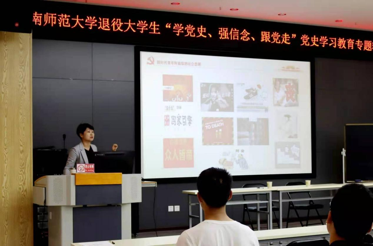蔡金红副校长为全场退役大学生介绍了我党的光辉历史,解读了我们党在百年时间里始终坚持的光荣传统和优良作风,激励全场退役大学生应该坚定信念、凝聚力量,用党的实践创造和历史经验启迪智慧、砥砺品格,把学史明理、学史增信、学史崇德、学史力行贯穿始终,发挥退役复学优秀大学生榜样群体的辐射作用。