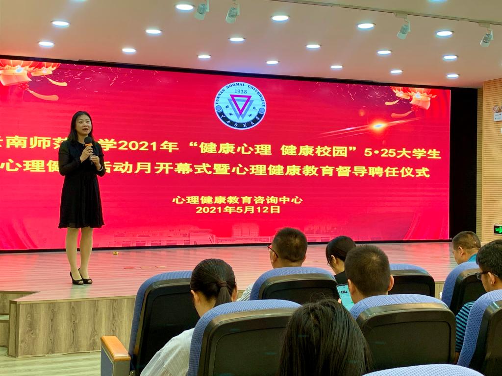 为贯彻落实《“健康中国2030”规划纲要》的要求,深入开展“健康心理 健康校园”主题教育活动,营造积极、健康、和谐的校园文化氛围,5月12日下午,太阳官网举办了2021年5·25大学生心理健康活动月开幕式暨心理健康教育督导聘任仪式。本次活动由心理健康教育咨询中心主办,副校长蔡金红、心理健康教育督导、心理健康教育咨询中心教师、学生代表和心晴志愿者近200名师生参加了本次活动。活动由心理健康教育咨询中心办公室主任尚云主持。