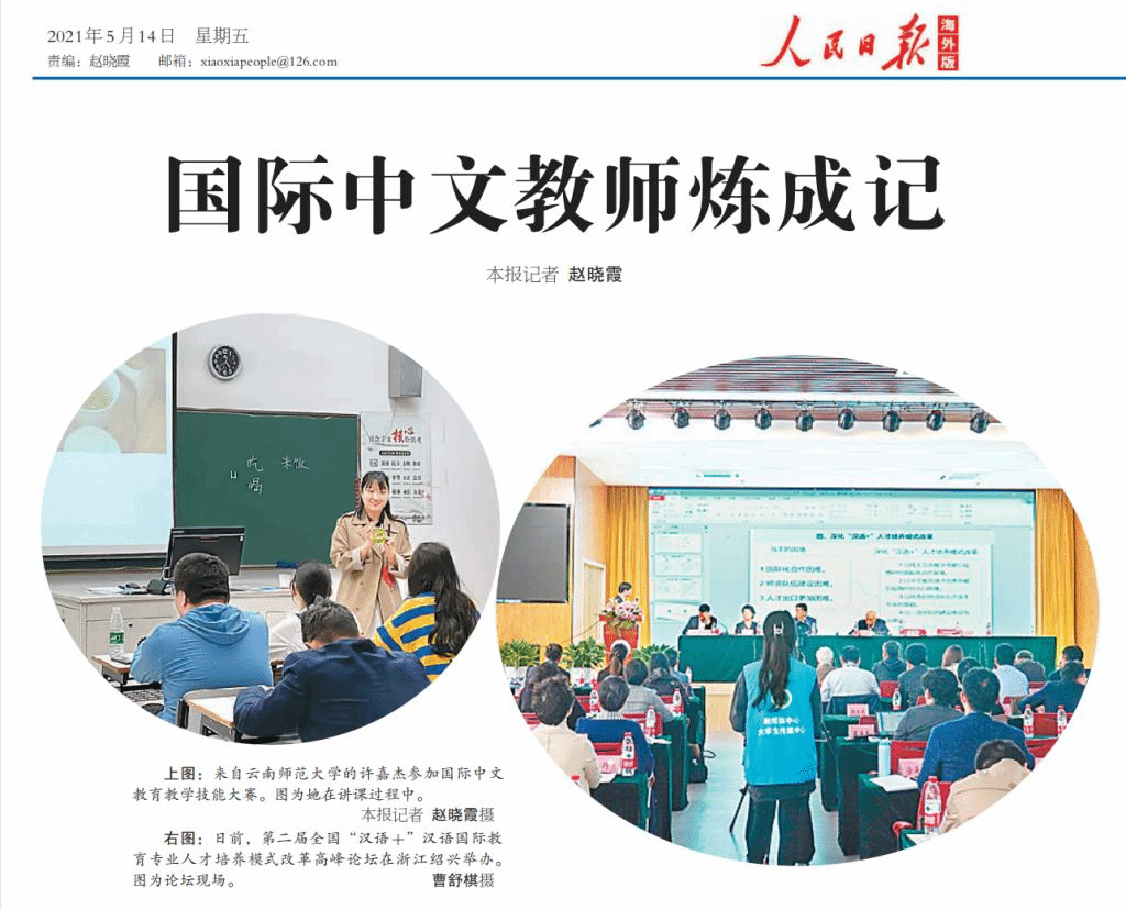 5月14日,《人民日报》(海外版)以“国际中文教师炼成记”为题,报道了“第二届全国‘汉语+’汉语国际教育专业人才培养模式改革高峰论坛暨国际中文教育教学技能大赛”的盛况,其中太阳官网2019级汉语国际教育专业硕士研究生许嘉杰荣登《人民日报》(海外版)。