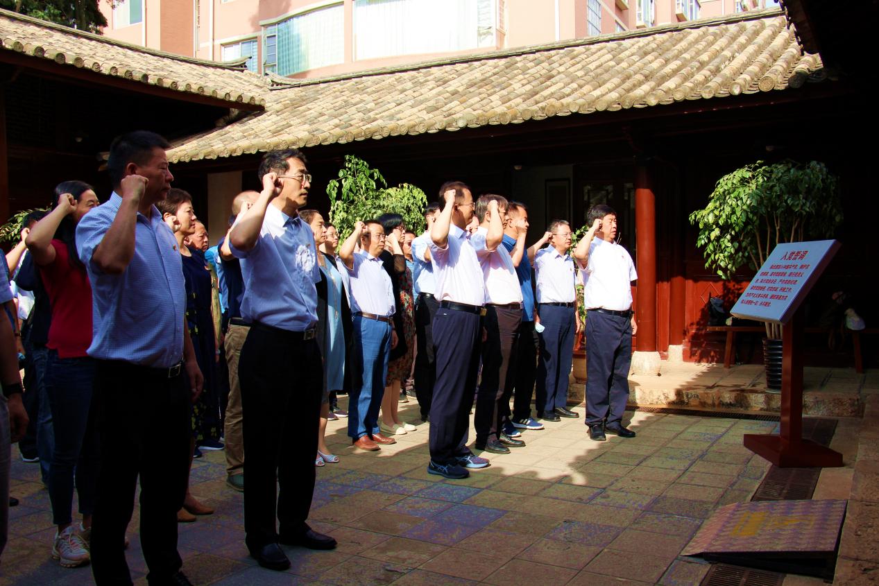 在昆明朱德旧居纪念馆,全体党员面对鲜红的党旗,在校党委书记饶卫的带领下,重温入党誓词。