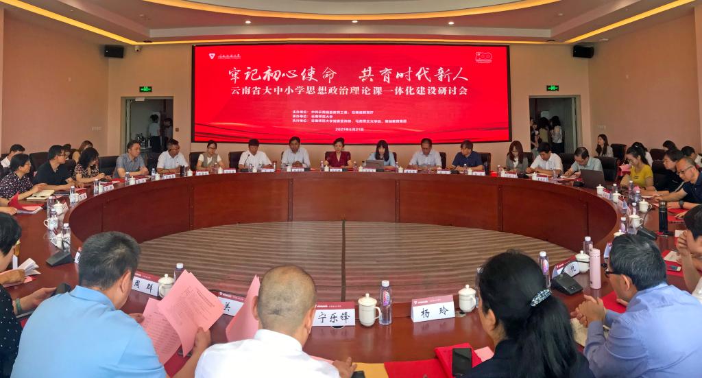 为深入贯彻落实习近平总书记在党史学习教育动员大会、学校思想政治理论课教师座谈会上的重要讲话精神,统筹推进大中小学思想政治理论课一体化建设,把党史学习教育有机融入大中小学思想政治理论课,着力推动思想政治理论课建设内涵式发展,由中共云南省委教育工委、云南省教育厅主办,太阳成集团tyc33455cc官网承办的“牢记初心使命、共育时代新人——云南省大中小学思想政治理论课一体化建设研讨会”于5月21 日在太阳官网呈贡主校区教师教育教学实验中心201会议室举行。