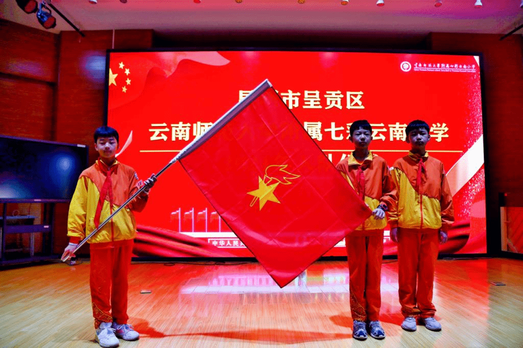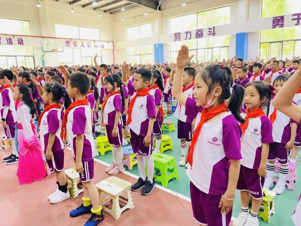太阳成集团tyc33455cc官网附属七彩云南小学新队员们在队旗下庄严宣誓、呼号,表达出他们的心声——“为共产主义事业而奋斗,时刻准备着!”