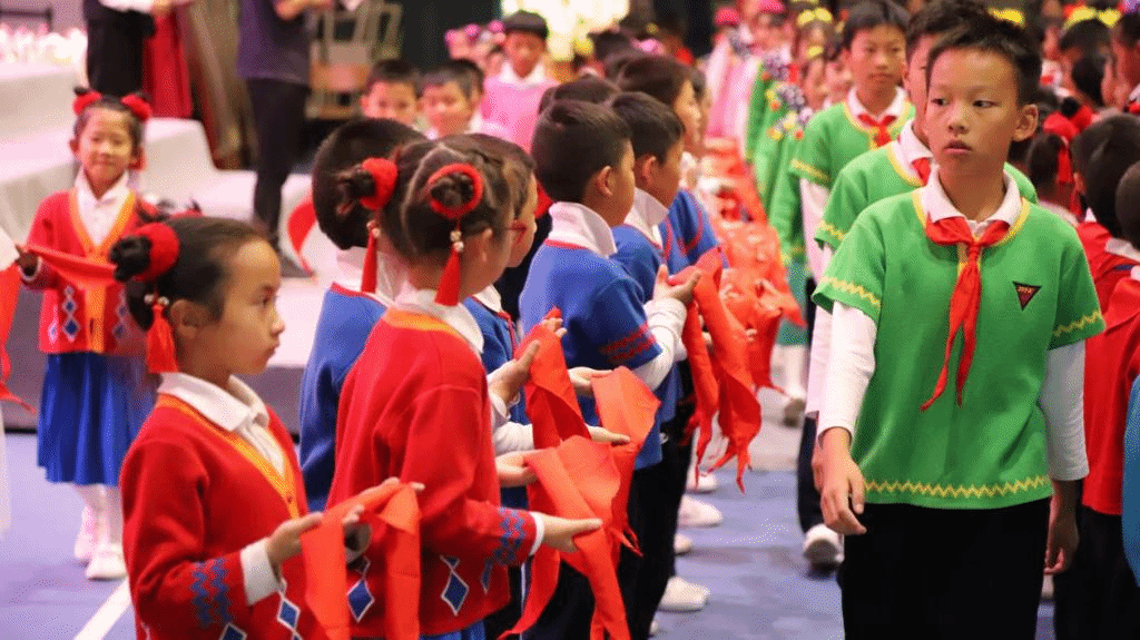 在队旗的见证下,新入队的少先队员们戴上了鲜艳的红领巾,成为了一名光荣的少先队员。火红的队旗高高飘扬,指引少儿前进的方向。鲜艳的红领巾系满理想,如一只红船,载着少儿扬帆远航。