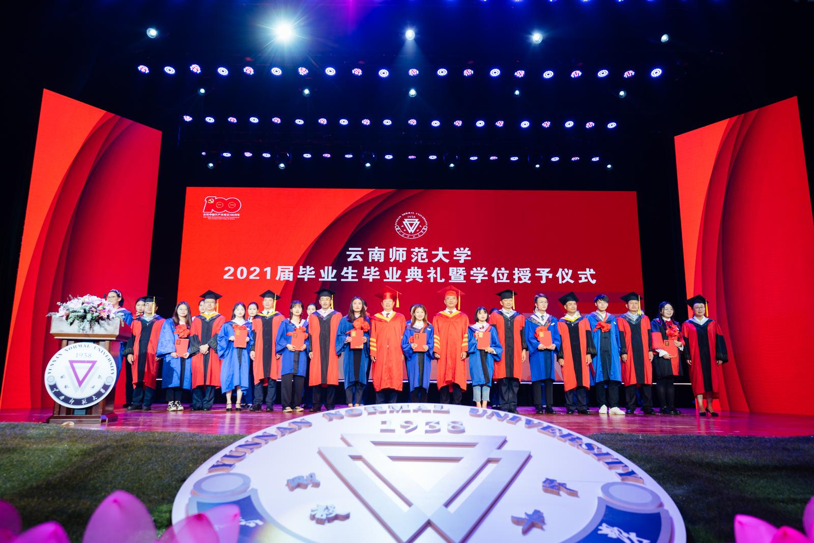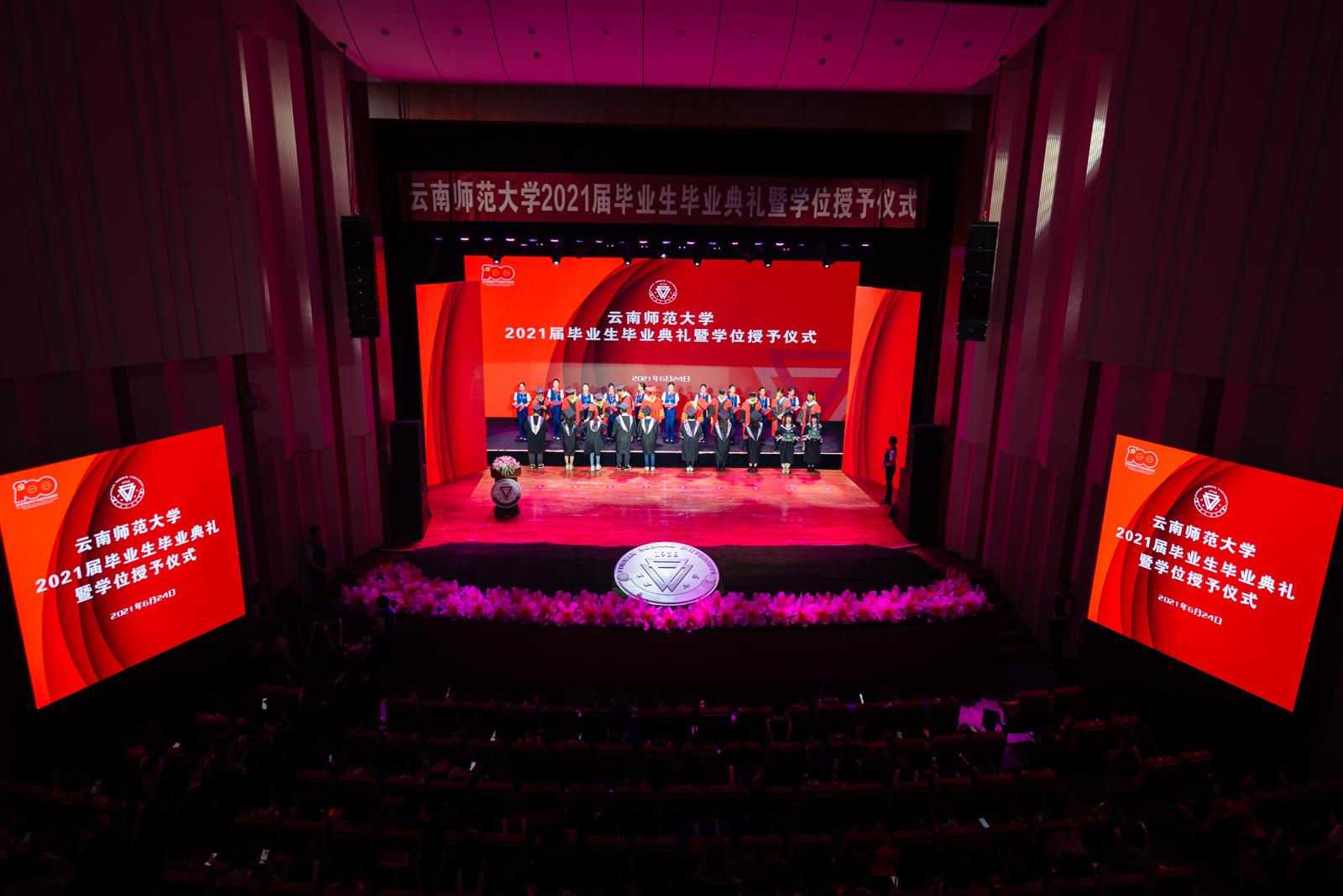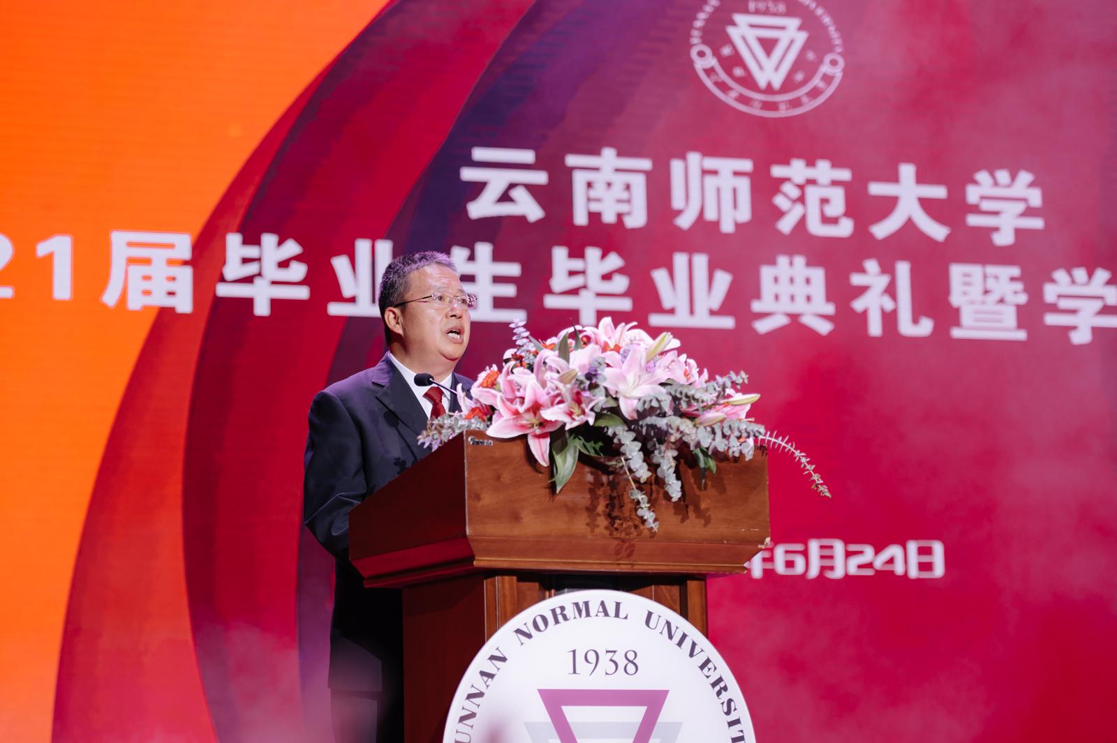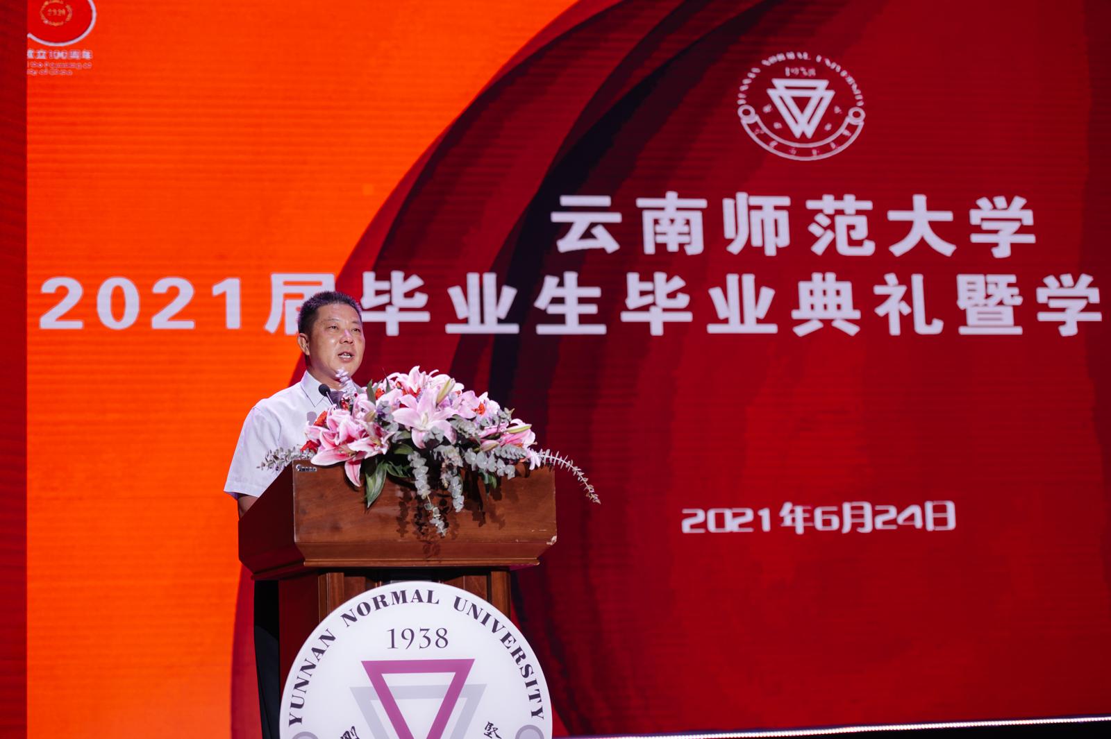6月24日下午,太阳成集团tyc33455cc官网2021届毕业生毕业典礼暨学位授予仪式在呈贡主校区明德5号楼演播厅举行。校党委书记饶卫,校长蒋永文,校党委副书记张玮、李宏,副校长刘宗立,校纪委书记王志刚,副校长牛治亮、安学斌、武友德、蔡金红、郝淑美,校学生工作领导小组成员单位负责人,各学院(学部)教师代表、毕业生代表共600余人参加毕业典礼。毕业典礼采取线上线下相结合的形式,超过10余万人次点击观看了现场同步直播。