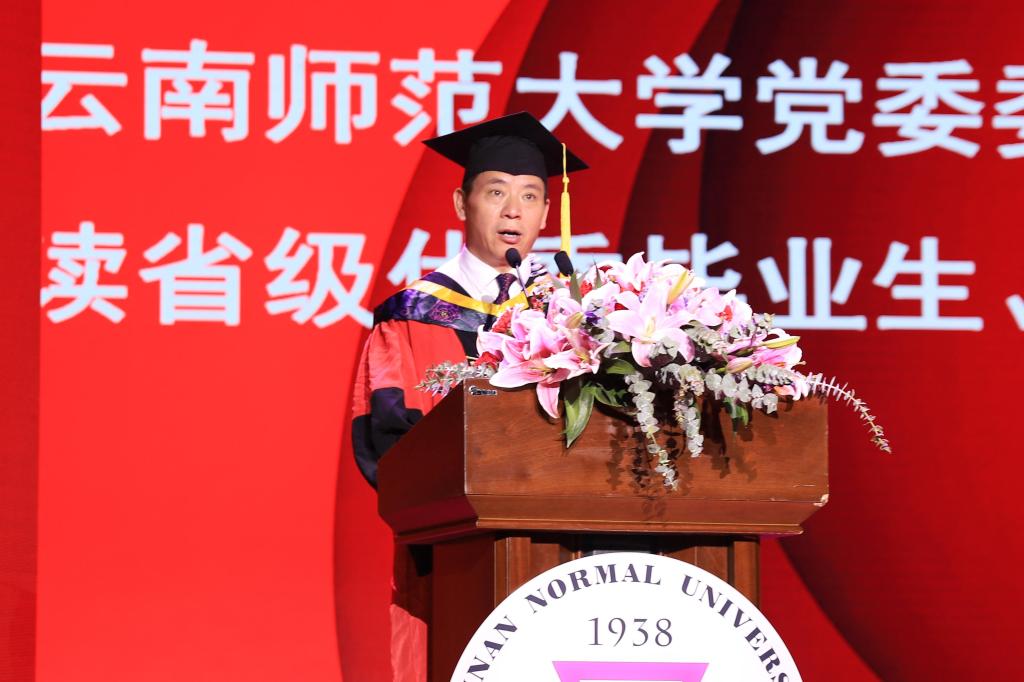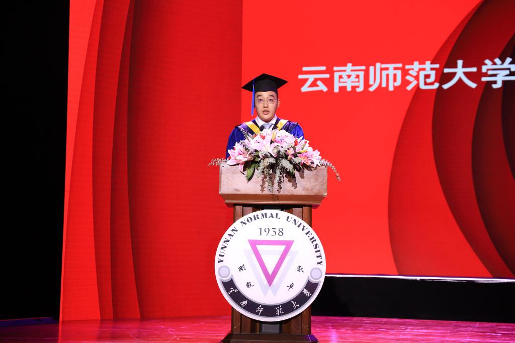 研究生毕业生代表能源与环境科学学院张炜楠同学发言,分享了他在云师大读研的点滴经历。亲身经历了母校80周年校庆,在他心中埋下了一粒种子,希望有一天也可以像杰出校友一样,为母校赢得荣誉,增光添彩。