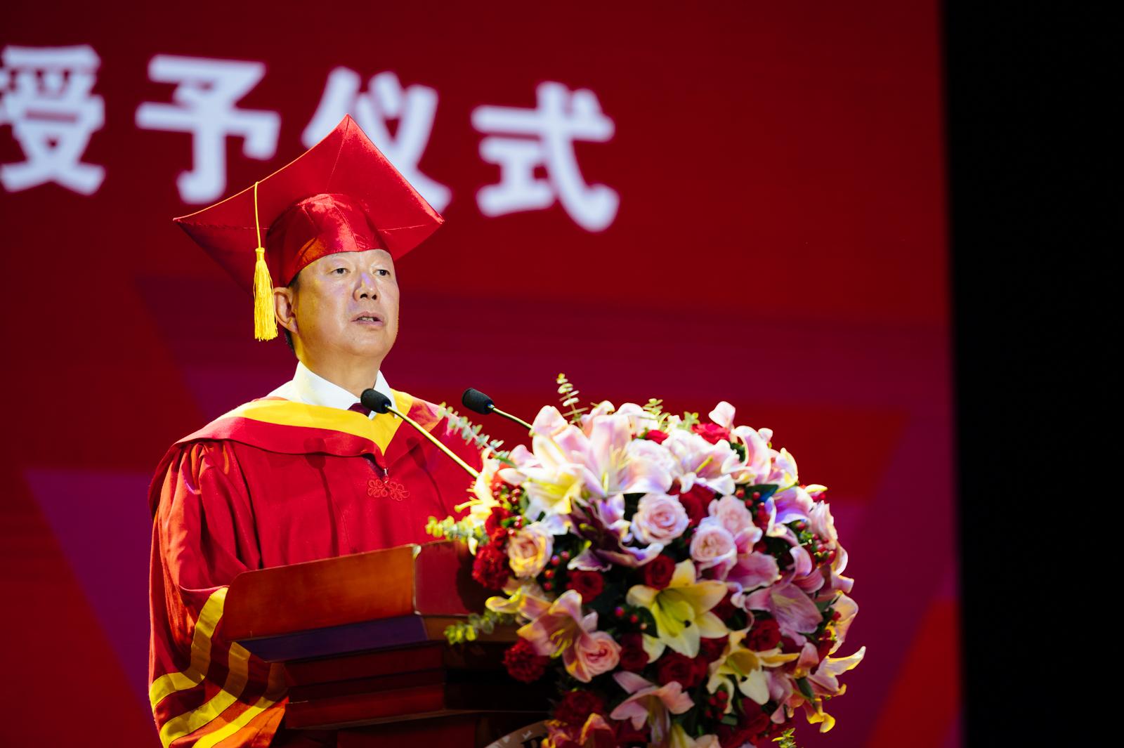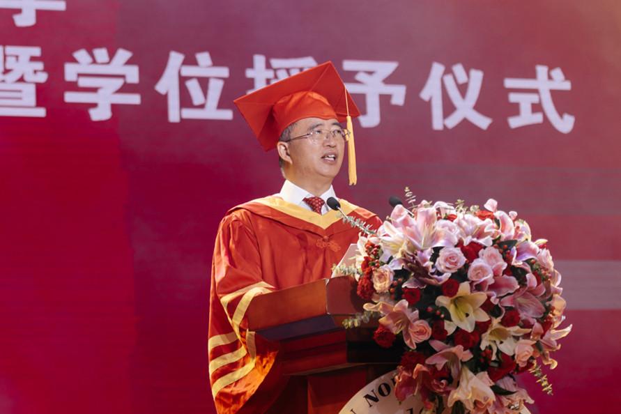 校学位评定委员会主席、校长蒋永文代表太阳成集团tyc33455cc官网全体教职员工,向今年毕业的7420名本科生、1608名硕士和博士致以热烈祝贺。蒋校长指出,同学们生活在一个伟大的时代,“两个一百年”奋斗目标历史交汇,中华民族伟大复兴战略全局和世界百年未有之大变局深度交融。在国家乘势而上开启全面建设社会主义现代化国家新征程,向第二个百年奋斗目标进军的伟大历史阶段,同学们的时代令人羡慕,既充满无限机遇,也肩负着书写时代历史的重担,更存在前所未有的挑战。为此,蒋校长对全体毕业生提出三点殷切期望:一是希望全体毕业生不忘初心,志存高远。永葆修身报国、胸怀天下的崇高追求,把个人发展、人生价值与时代需要、国家民族发展需要紧密结合,在实现中华民族伟大复兴的新征程上建功立业。二是希望全体毕业生脚踏实地,砥砺前行。梦想是天上的星辰,永恒地照亮我们的人生;现实是脚下的土地,真实地记录着我们的足迹。作为时代新人,要走出“舒适圈”、勇闯“无人区”,主动拒绝“躺平”,积极应对“内卷”,用一点一滴的积累和锲而不舍的努力,面对人生路上的挫折与考验,迈向美好的未来。三是希望全体毕业生勇于创新,引领时代。坚持培养创新性心态、开拓创新性视野、提升创新性能力,始终以创新的思维对待学习、工作甚至生活的方方面面,在创新中激发灵感,在创新中实现价值,在创新中引领时代。