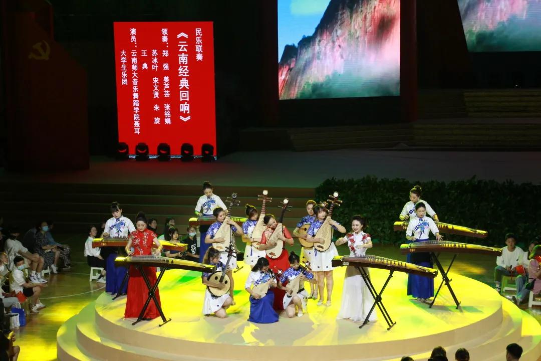 民乐联奏《云南经典回响》用葫芦丝、二胡、古筝、琵琶等中华传统乐器演奏了具有云南少数民族特色的曲目,悠扬的管弦之声演绎出在党的领导下人民翻身做主,少数民族团结富强,过上幸福美好生活的场景。