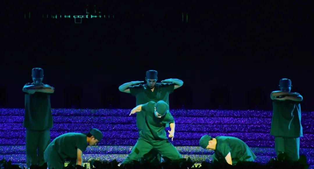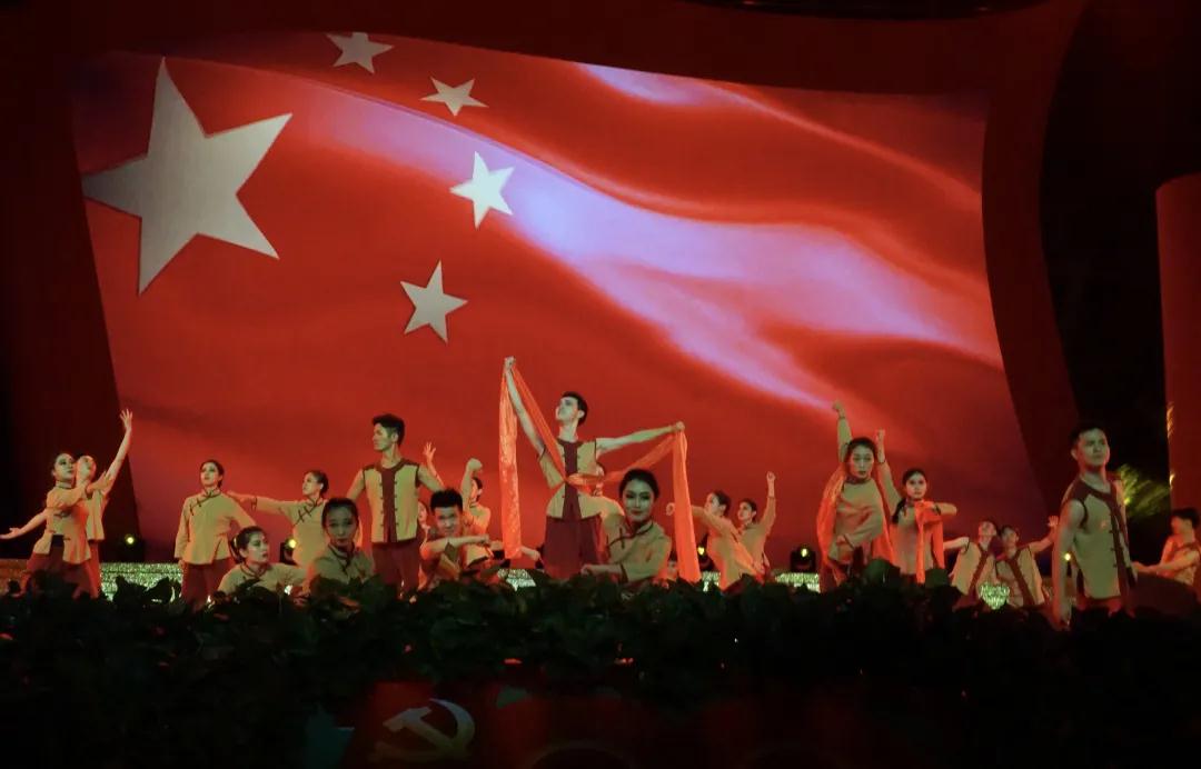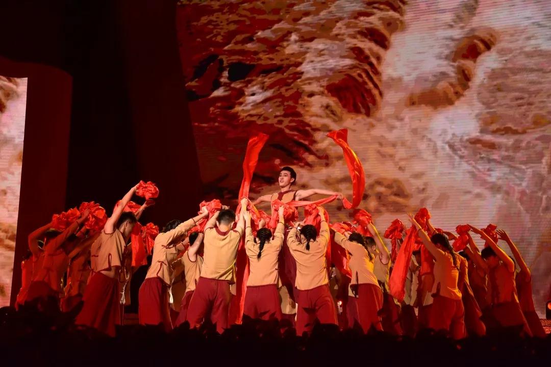 随着舞蹈者刚健的步伐,红色的绸带在台上飘扬舞动。以《东方红》为背景的群舞,生动展现了共产党人“为人民谋幸福、为民族谋复兴”的初心使命,表达了人民群众对党的真挚情感和朴素心声。