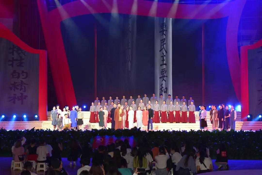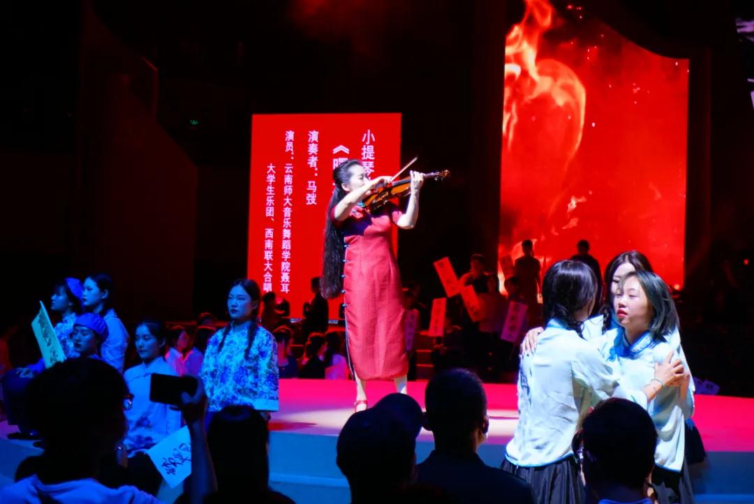 “红烛啊!莫问收获,但问耕耘。”《西南联大组歌》片段《红烛颂》讲述了烽火岁月中,为保存教育的火种,三校师生历经艰辛辗转南迁昆明合组西南联大,在极端艰苦的条件下鼎力治学研究,坚持为国育才的动人场景。西南联大教授闻一多先生拍案而起,发表最后一次演讲,为争取民主与正义献出宝贵生命的故事,让在场师生再次感悟到闻一多先生深沉的赤子情怀。
