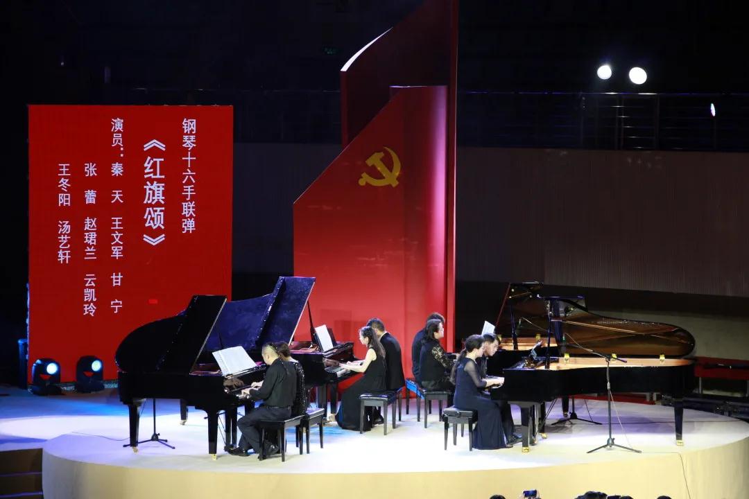 行云流水的音符旋律从8名钢琴演奏者手中流出,时而婉转,时而激昂,他们用琴声述说着对党的恩情,诉说着对鲜红旗帜的热爱。