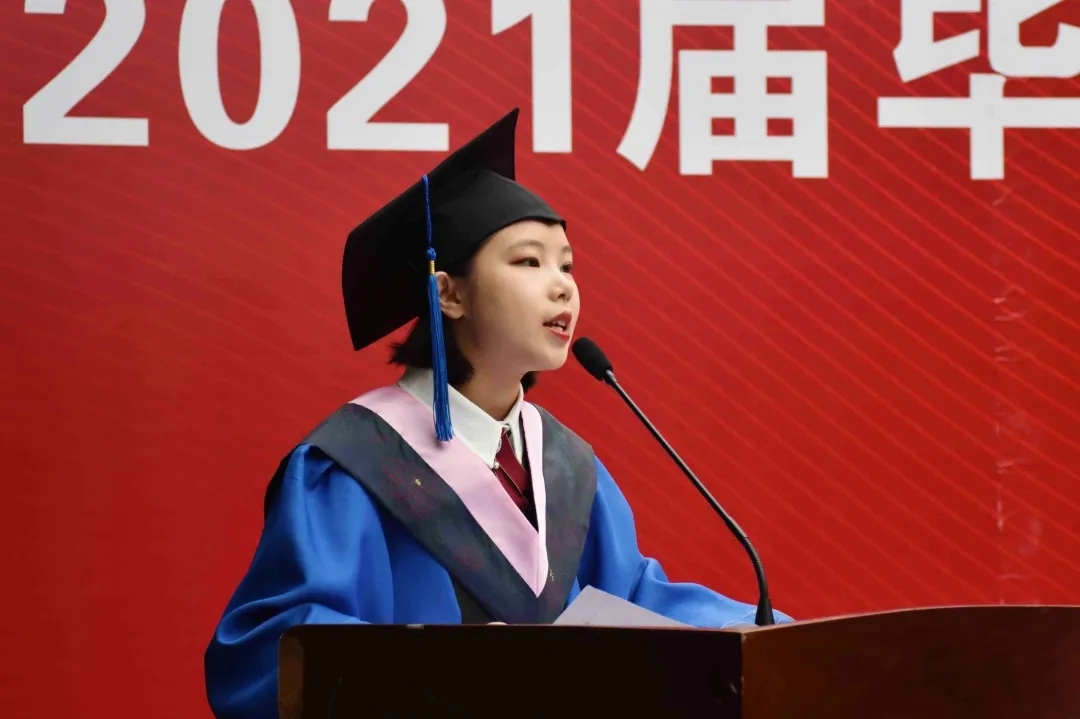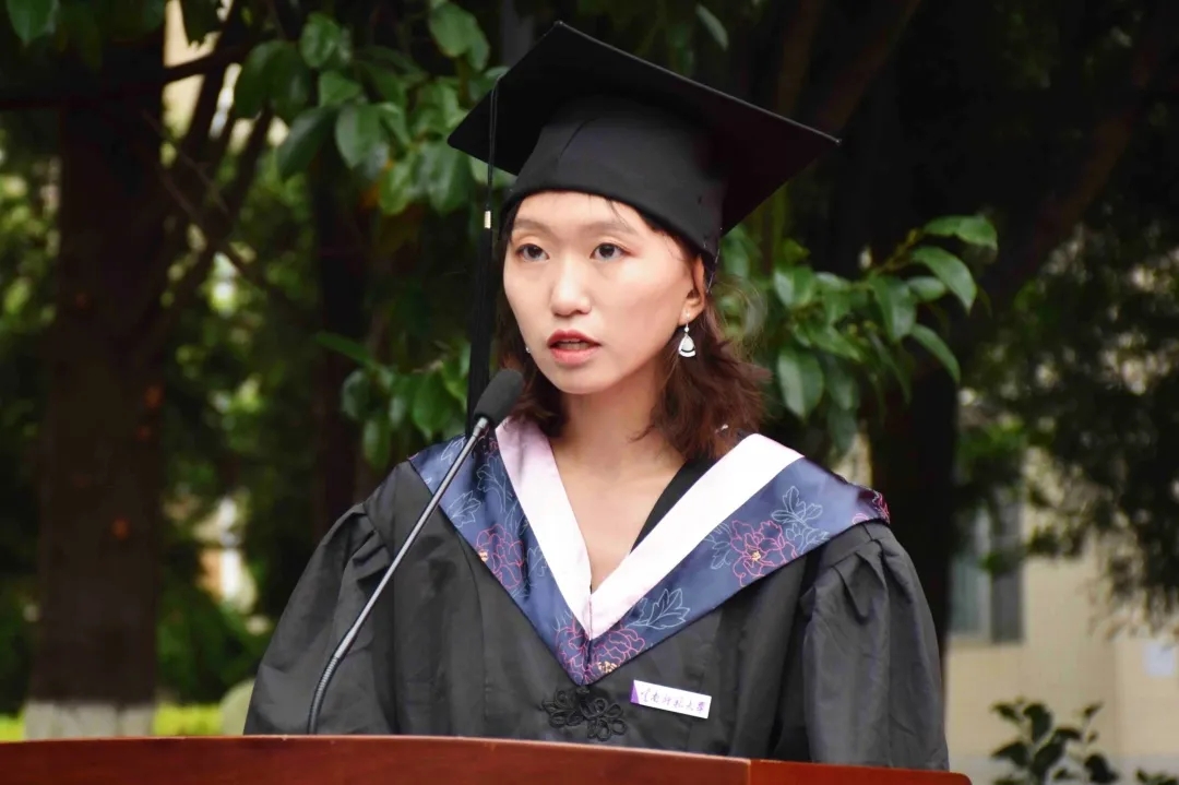本科毕业生代表孙文宇同学表示,在母校的培养下自己成为了一名中国共产党党员,在这里她学会了奉献和付出,深刻领会了全心全意为人民服务的宗旨,也愈发坚定了奋斗的方向,她即将奔赴新疆喀什从事乡村教育工作,让青春之花绽放在祖国最需要的地方。