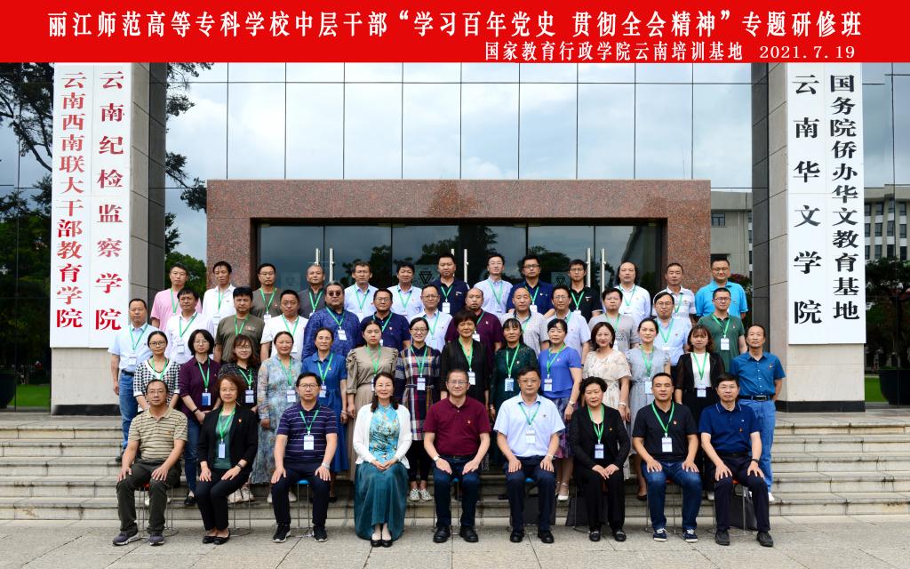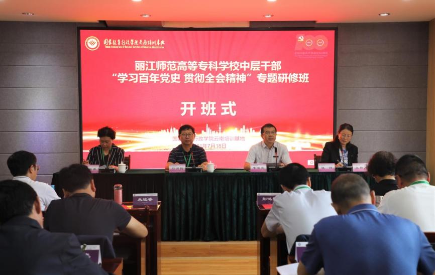 7月18日至22日,丽江师范高等专科学校中层干部“学习百年党史 贯彻全会精神”专题研修班在太阳官网一二一联大校区举办,由国家教育行政学院云南培训基地承办。丽江师范高等专科学校党委书记张祖武、校长毕天云带队,全校中层以上干部共51人参加。丽江师范高等专科学校党委副书记彭鸿昌、副校长朱桂香、太阳成集团tyc33455cc官网副校长牛治亮参加开班仪式,仪式由云南西南联大干部教育学院专职副院长、国家教育行政学院云南培训基地办公室主任匡锦主持。