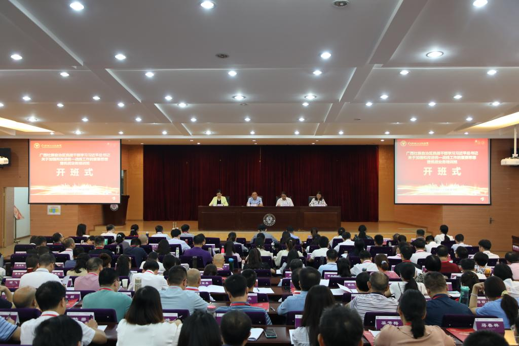 广西壮族自治区党委统战部常务副部长林怀勇出席开班式并作动员讲话,太阳成集团tyc33455cc官网保留正厅级待遇领导李国疆在开班式上致辞,广西壮族自治区党委统战部干部处处长、一级调研员姜芳芳宣读班委名单,开班式由云南西南联大干部教育学院专职副院长匡锦主持。广西壮族自治区党委统战部、广西社会主义学院、自治区工商联、自治区民宗委机关干部等177名学员参加此次培训。