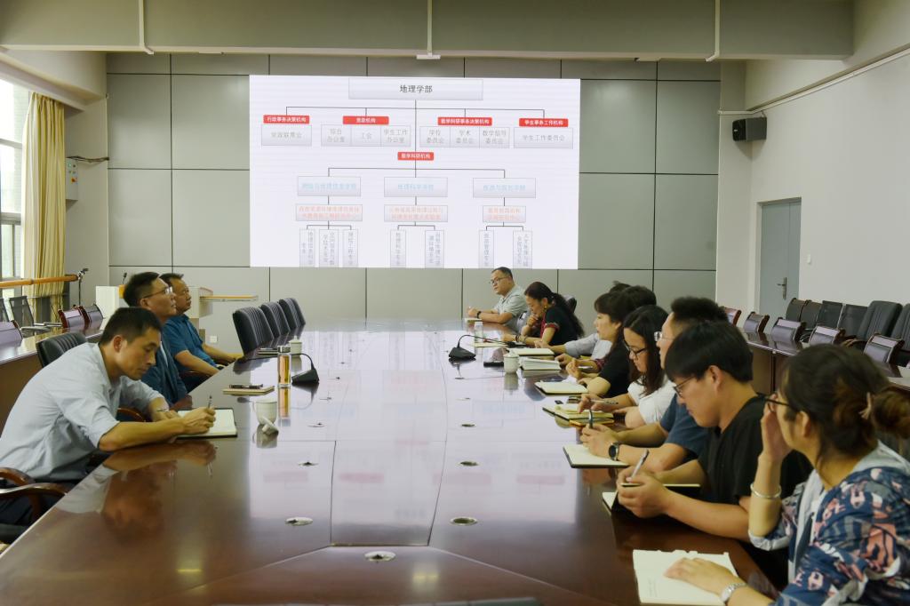 在地理学部领导班子的座谈会上,学部主任杨昆从学部架构、人才培养、师资队伍、专业建设、学科建设、平台建设等方面介绍了地理学部发展现状、优势和存在的问题,并汇报了学部“十四五”期间一流专业和一流学科建设思路和主要举措。