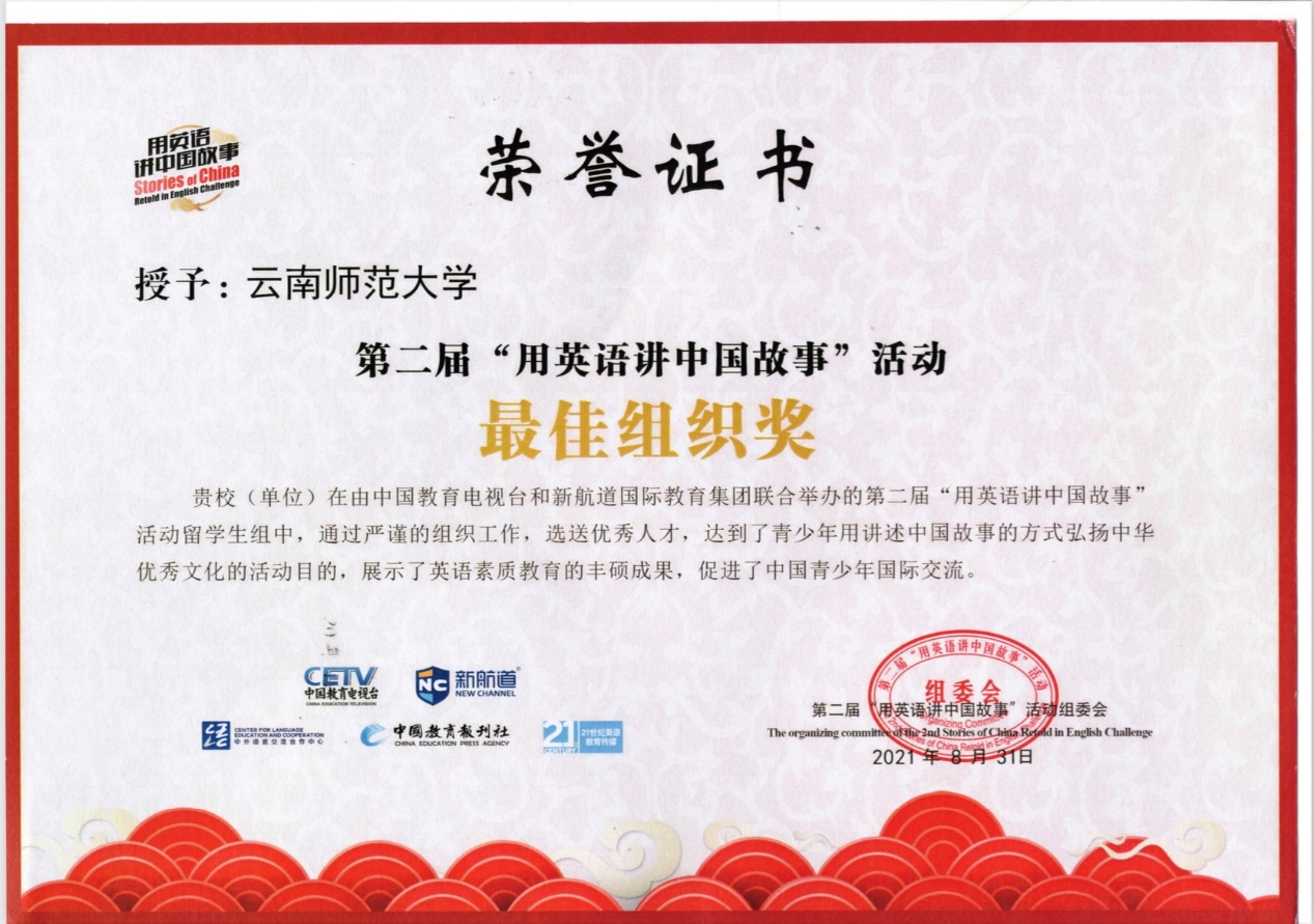 2021年4至8月,中国教育电视台、新航道国际教育集团、教育部中外语言交流合作中心、中国教育报刊社联合主办了第二届“用英语讲中国故事”活动,旨在为青少年提供一个弘扬中华优秀文化、与世界交流的平台。本届活动首次将参加对象扩大到来华留学生。因太阳官网在留学生组活动中的出色表现,活动组委会授予太阳成集团tyc33455cc官网第二届“用英语讲中国故事”活动最佳组织奖。