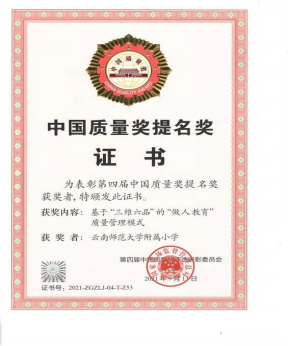 云南师大附小于2017年入围中国质量奖提名候选、2019年获昆明市第九届市长质量奖、2020年获云南省第四届政府质量奖,成为2021年首家全国质量奖专家进场评审的小学。坚守基础教育的平凡,追逐质量强国的卓越,云南师大附小一直在路上。