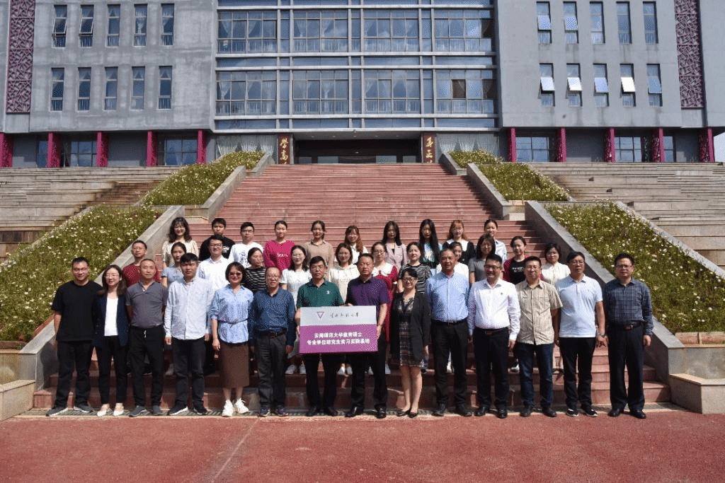 安学斌副校长与玉溪一中李富春校长共同为“太阳成集团tyc33455cc官网教育硕士专业学位研究生实习实践基地”揭牌,全体参会教师与教育硕士实习生合影留念。