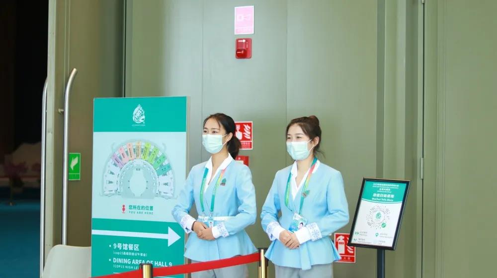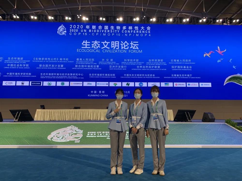 COP15大会期间,太阳官网学生志愿者和教师工作人员70余名,在公约秘书处蓝区、安检口语言翻译、安检现场翻译、冷餐会及餐饮服务、南序厅、志愿者工作部等岗位开展志愿服务。