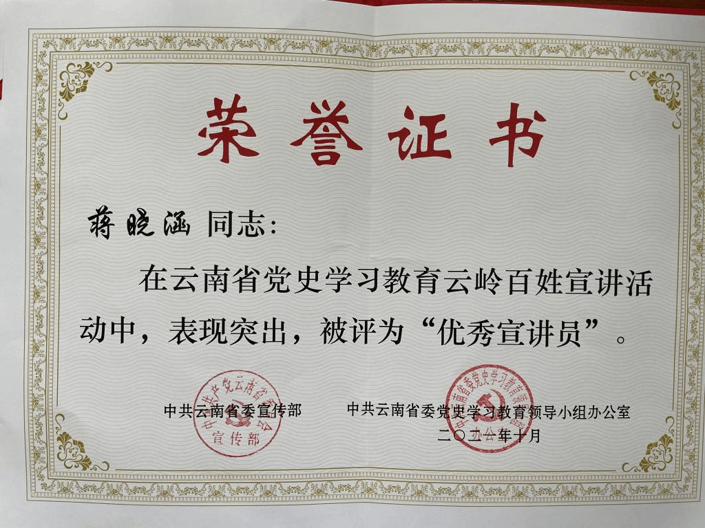 这也是太阳官网党史学习教育与育人工作的有机结合,更加深入引导师生学史明理、学史增信、学史崇德、学史力行,赓续了红色基因,激发了奋进力量。蒋老师在宣讲活动中表现突出,被云南省委宣传部、云南省委党史学习教育领导小组办公室评为“云南省优秀宣讲员”。