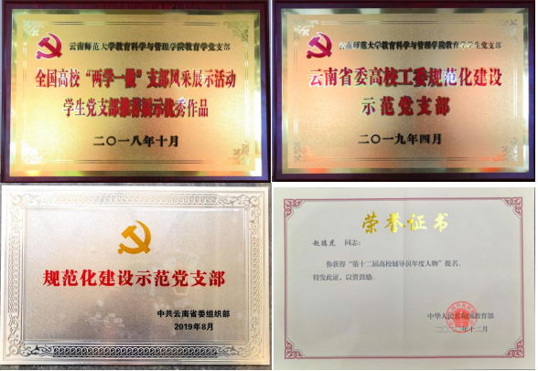 教育学党支部《构建“学·做·创”三维学习模式》入选全国“两学一做”优秀案例,同时被评为云南省委组织部、云南省委教育工委规范化达标示范党支部、云南省委高校工委创一流示范党支部。学部团委荣获“云南省五四红旗团委”荣誉称号,4个班级荣获“省级优秀班集体”称号;学部2个团支部获得共青团中央学校部授予的“活力团支部”荣誉称号,西区2-411宿舍在寻访“中国大学生百炼之星”活动中获得“中国大学生百炼之星”的称号。辅导员赵德虎荣获第十二届全国“高校辅导员年度人物”提名奖、第七届全国高校辅导员素质能力大赛二等奖,获云南省“2020年最美高校辅导员”称号等。“刘虹辅导员工作室”获省级支持和批准,刘虹在云南省第九届辅导员素质能力大赛获二等奖,“最佳博才奖”;辅导员王友良在第五届云南省高校心理健康教育教师职业能力大赛获一等奖,在第十届云南省辅导员素质能力大赛获二等奖。