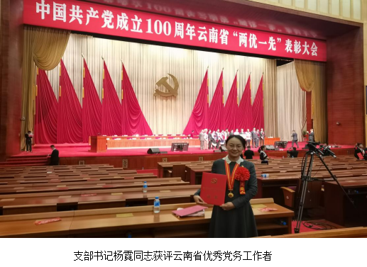 在云南省委、省委教育工委、学校党委和学院党委的正确领导下,支部自2018年起,先后获评全国第一批“全国党建工作样板支部”、全国第二批高校“双带头人”教师党支部书记工作室、“云南省创一流党建示范党支部”、“云南省规范化建设示范党支部”、“太阳成集团tyc33455cc官网优秀党支部”。在建党100周年之际,支部书记杨霓同志获评“云南省优秀党务工作者”,副书记黄晓丽同志和老党员孙兴文同志荣获“太阳成集团tyc33455cc官网优秀共产党员称号”。
